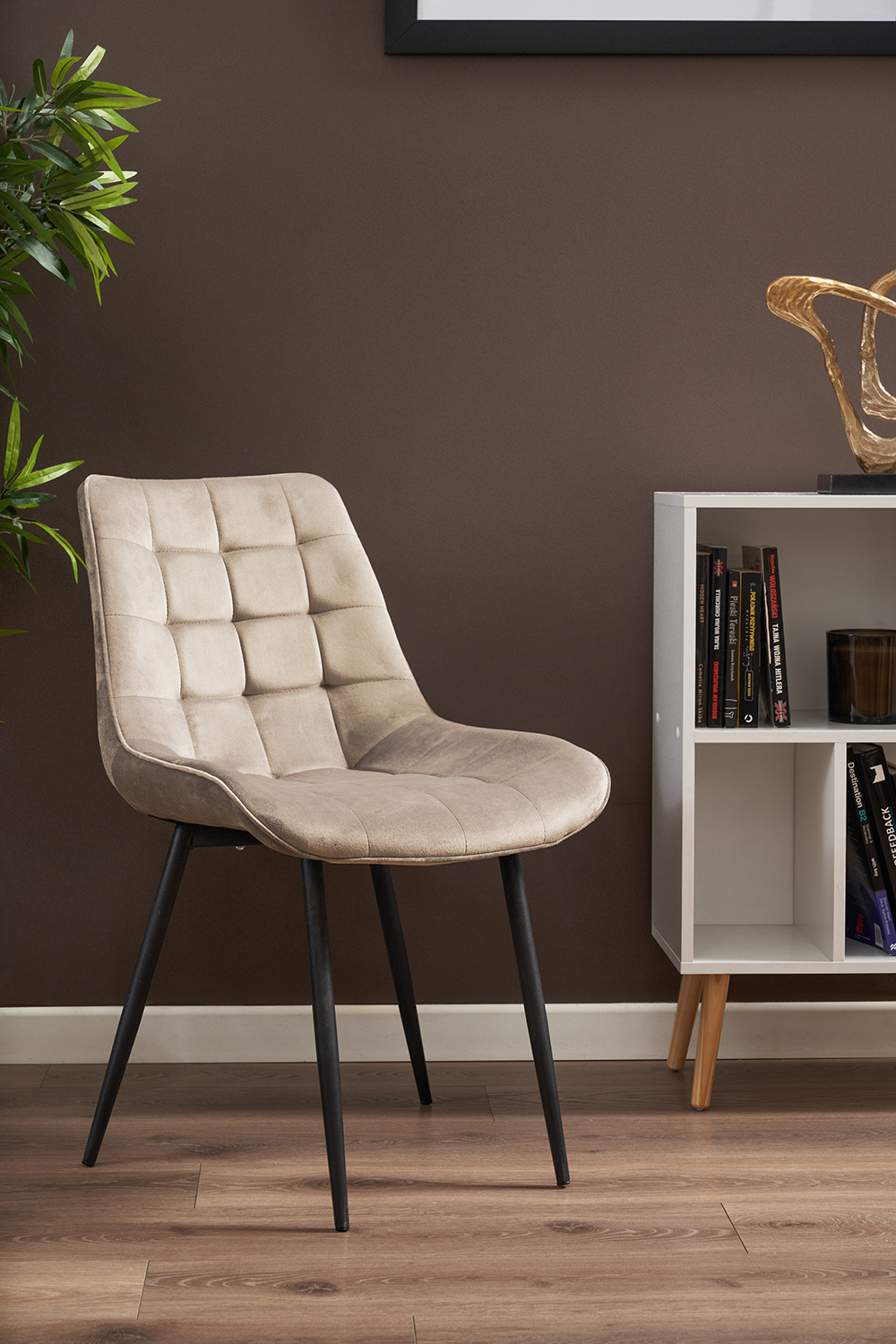 Aksamitna tapicerka uszyta z welurowej tkaniny wygląda niezwykle delikatnie, a wysokie i smukłe nóżki w czarnym kolorze wyglądają bardzo szykownie oraz gwarantują idealną stabilność.