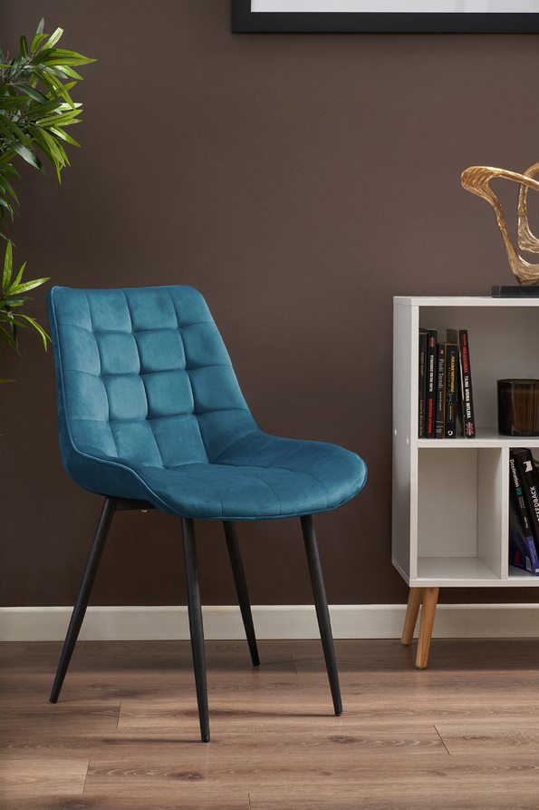 Aksamitna tapicerka uszyta z welurowej tkaniny wygląda niezwykle delikatnie, a wysokie i smukłe nóżki w czarnym kolorze wyglądają bardzo szykownie oraz gwarantują idealną stabilność.