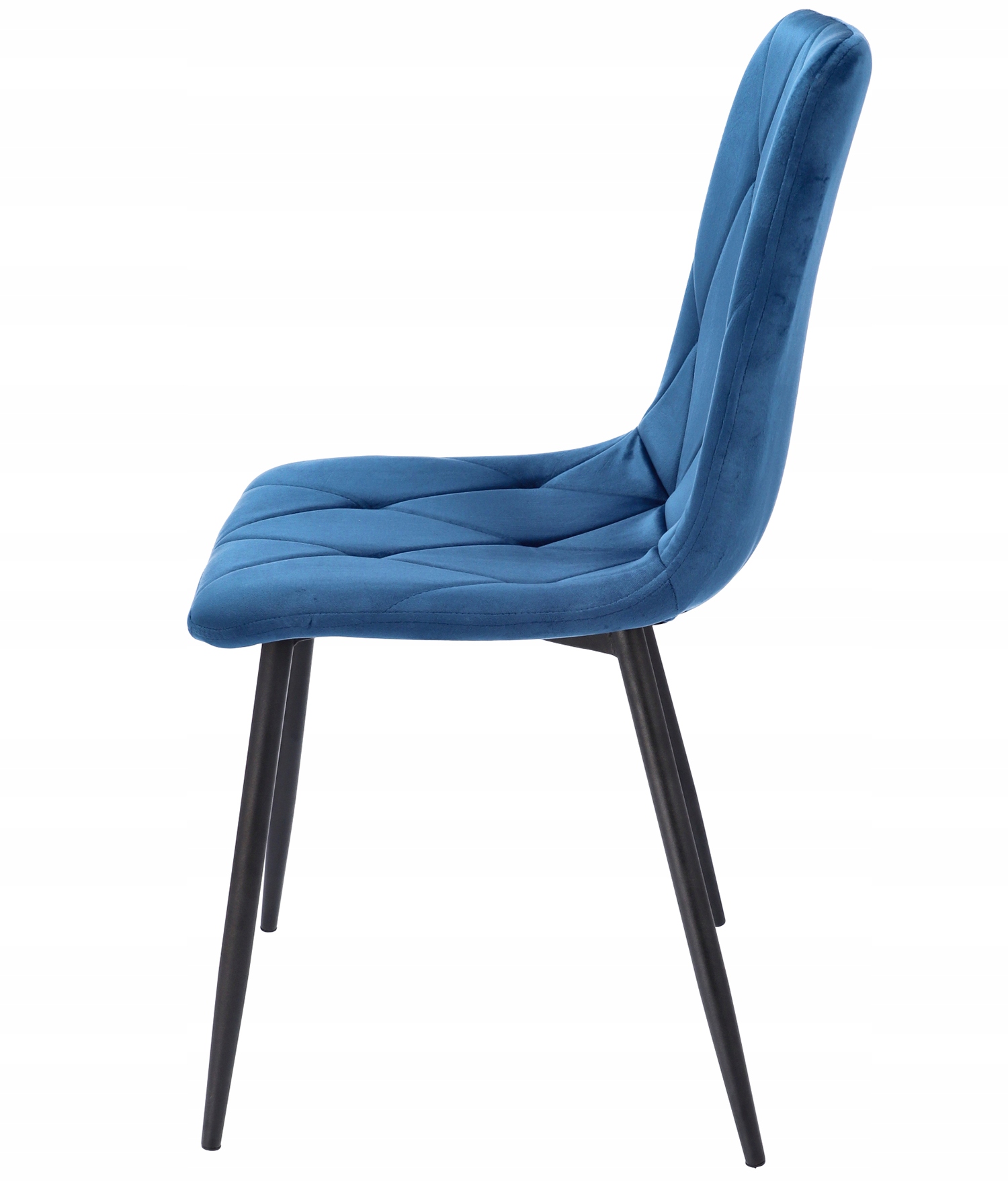 Krzesło tapicerowane jest welurem, a po wewnętrznej stronie pikowane regularnymi przeszyciami w romby. Wysokie i smukłe nóżki w czarnym kolorze wyglądają bardzo szykownie oraz gwarantują idealną stabilność.