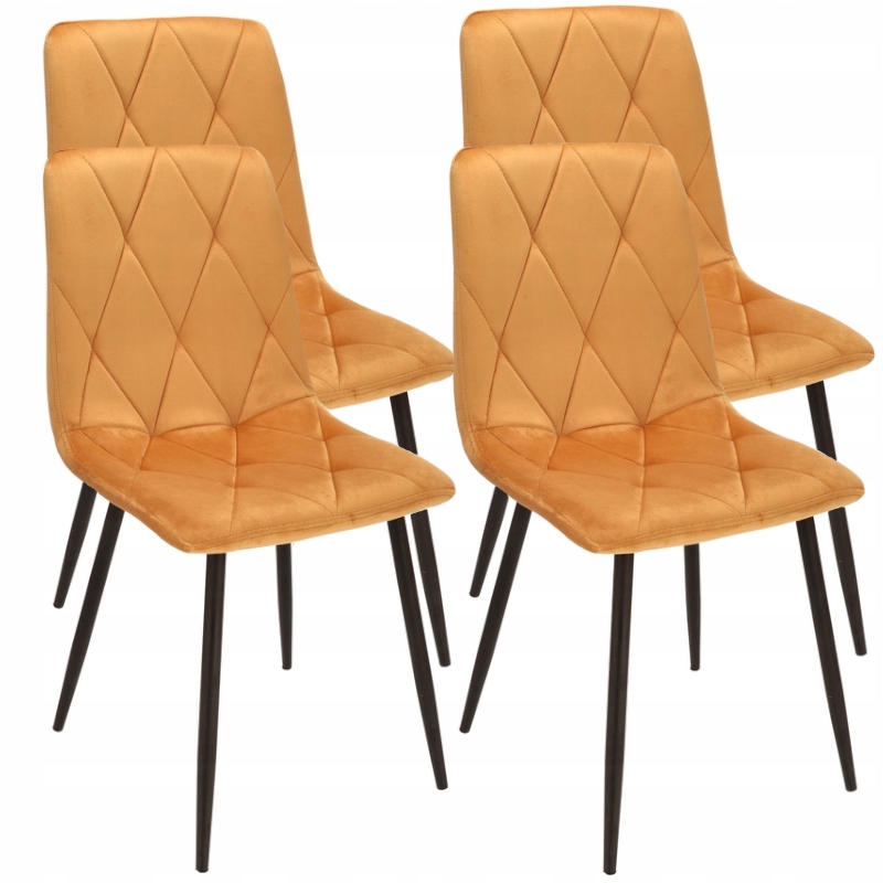 ➡️ Krzesła tapicerowane są welurem, a po wewnętrznej stronie pikowane regularnymi przeszyciami w romby. Wysokie i smukłe nóżki w czarnym kolorze wyglądają bardzo szykownie oraz gwarantują idealną stabilność.