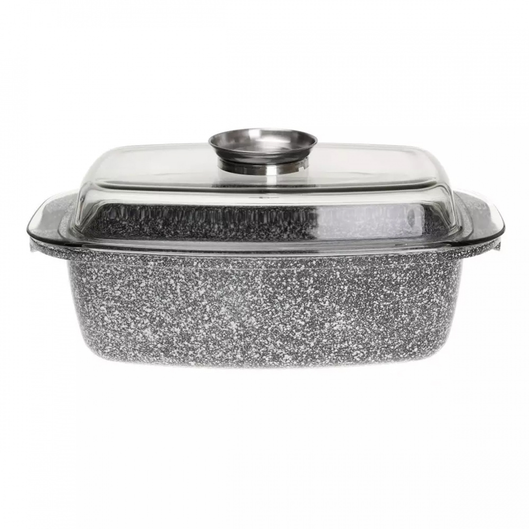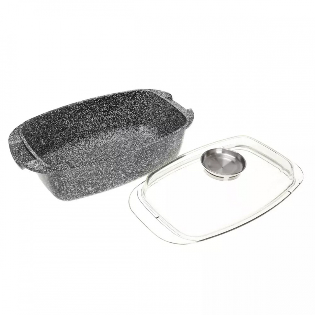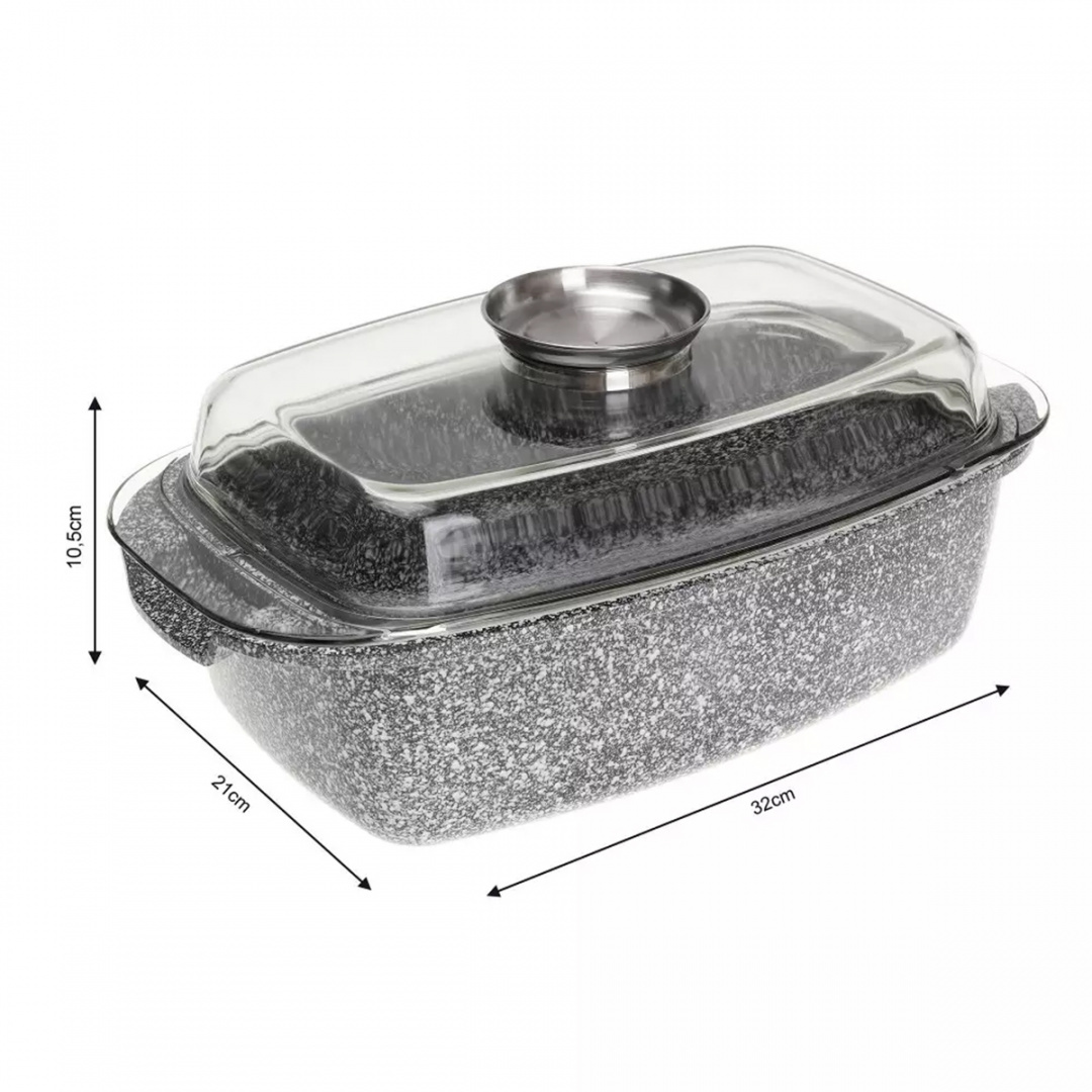 Brytfanna z pokrywą pokryta ceramiczną marmurową powłoką nieprzywierającą. Naczynia wykonane ze stopu aluminium posiadają indukcyjne ferromagnetyczne dno. Są przystosowane do współpracy z każdym rodzajem kuchni, także płytami indukcyjnymi. Naczynie w komplecie posiada żaroodporną pokrywę z aromatyzerem, dzięki której możemy uzupełnimy płyny w przygotowywanej potrawie bez ściągania pokrywy co pozwoli nam nie utracić tak niezbędnych w pożywieniu witamin i nada potrawie wspaniały smak.