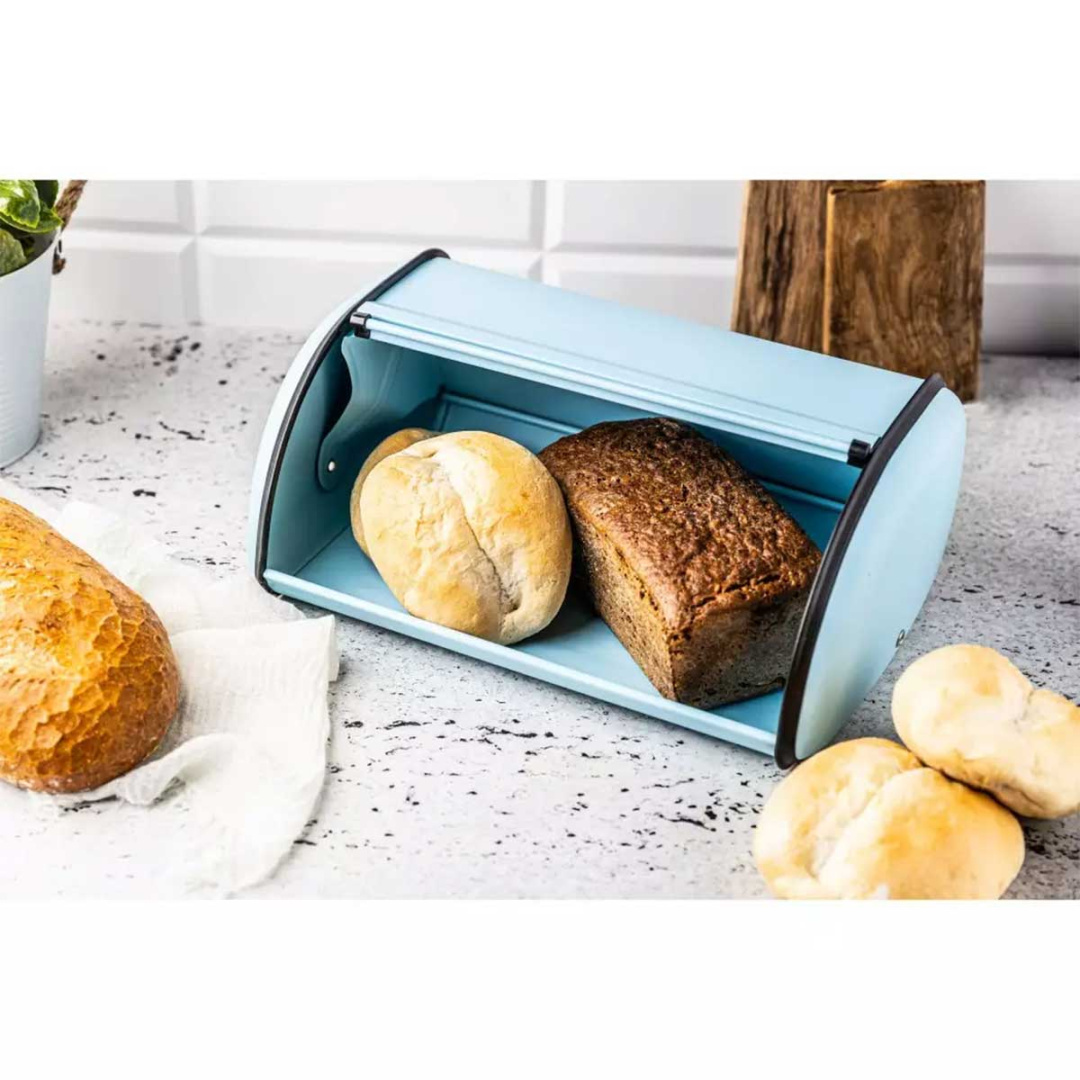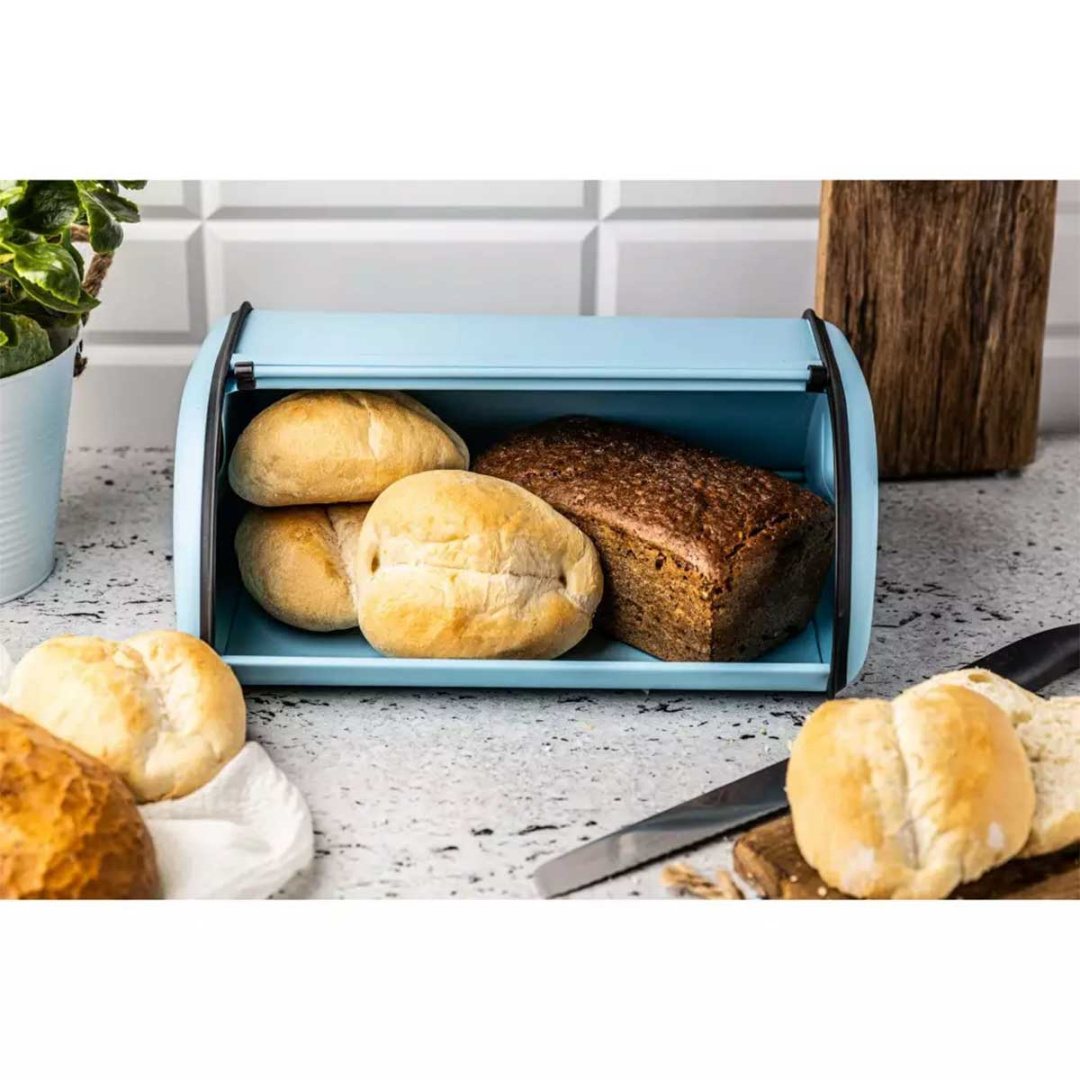 Duży pojemnik na pieczywo typu roll top wykonany z lakierowanej stali nierdzewnej w kolorze niebieskim.