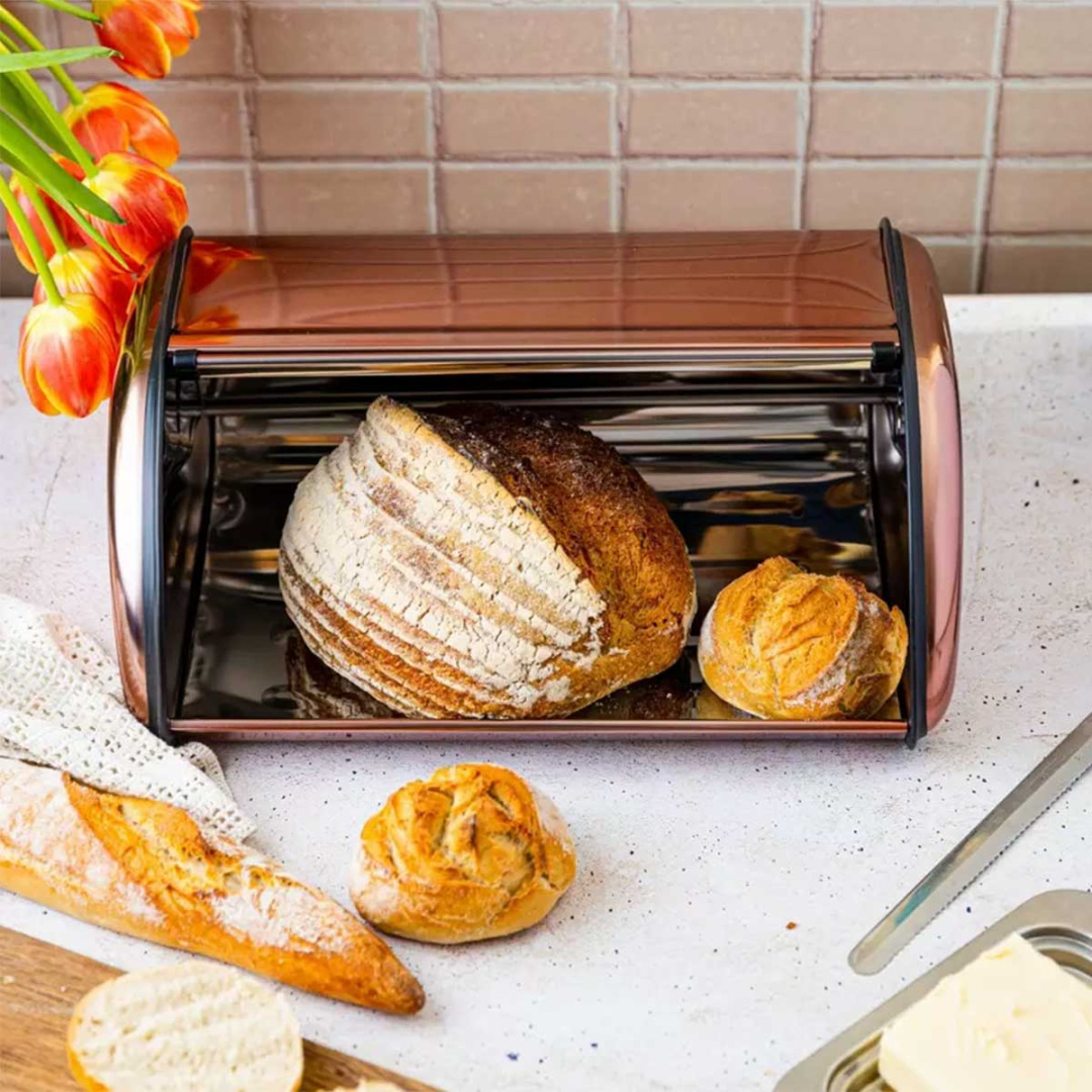 Duży pojemnik na pieczywo typu roll top wykonany ze stali nierdzewnej w kolorze różowego złota.