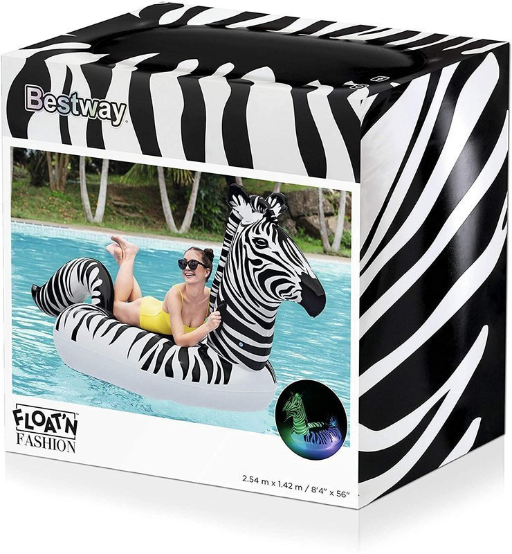 Dmuchany materac Zebra to wspaniały sposób na letni odpoczynek. Piękna kolorystyka oraz niebanalny kształt z pewnością zachwycą wszystkich miłośników wodnego odpoczynku. Urozmaici on letnie zabawy oraz pozwoli się zrelaksować. Ten wyjątkowy materac posiada światła LED, dzięki czemu zebra świeci a nocą staje się bardziej widoczna.Posiada również dwa stabilne uchwyty umiejscowione po dwóch stronach oraz szerokie siedzisko co zapewnia stabilność oraz wygodę w użytkowaniu. To dmuchane akcesorium do pływania sprawdzi się w każdych warunkach zarówno nad morzem, jeziorem jak i basenie. Jest wykonany z wytrzymałego materiału winylowego dzięki czemu jest on odporny na uszkodzenia zarówno mechaniczne jak i te, które mogą być powodowane przez promienie słoneczne bądź wodę morską.