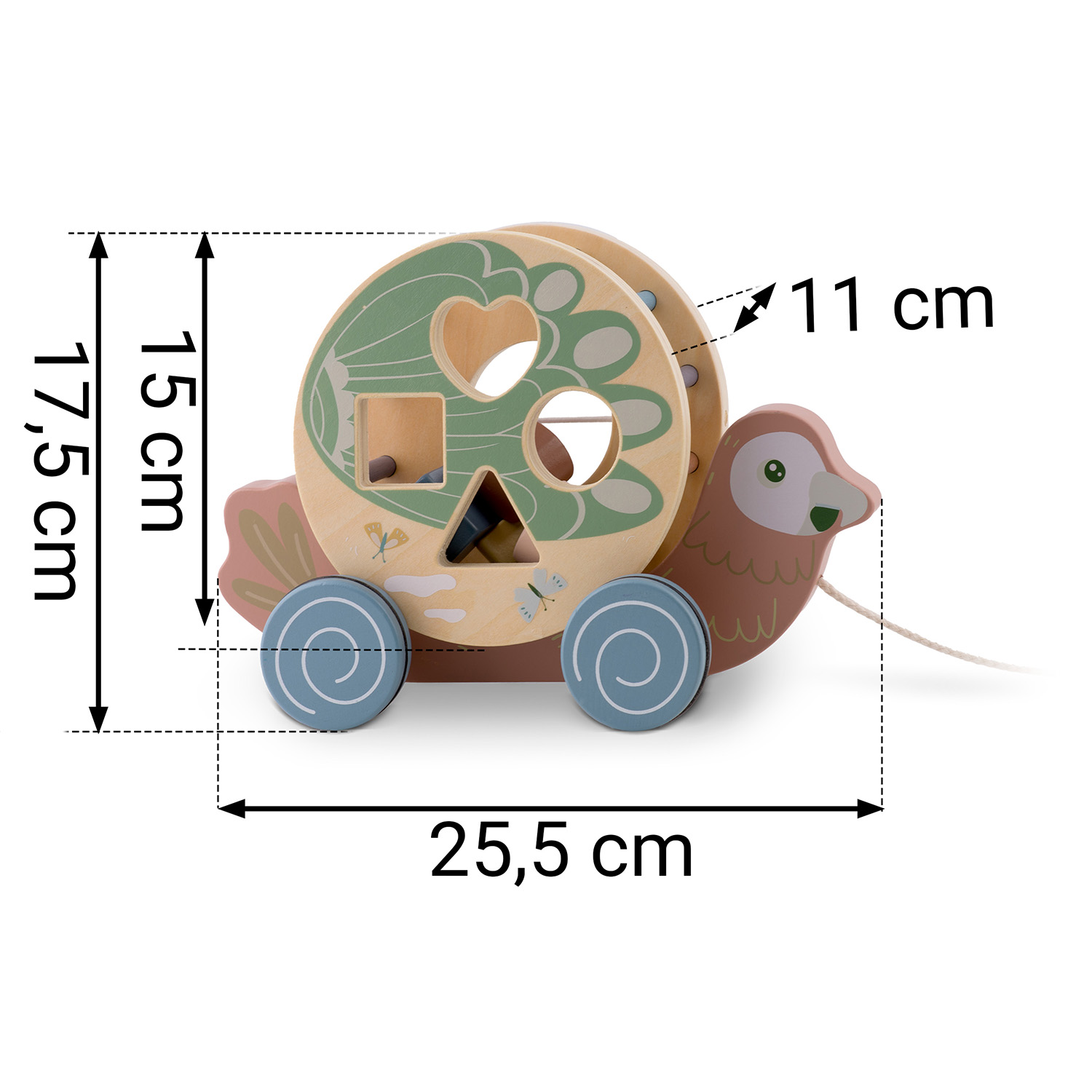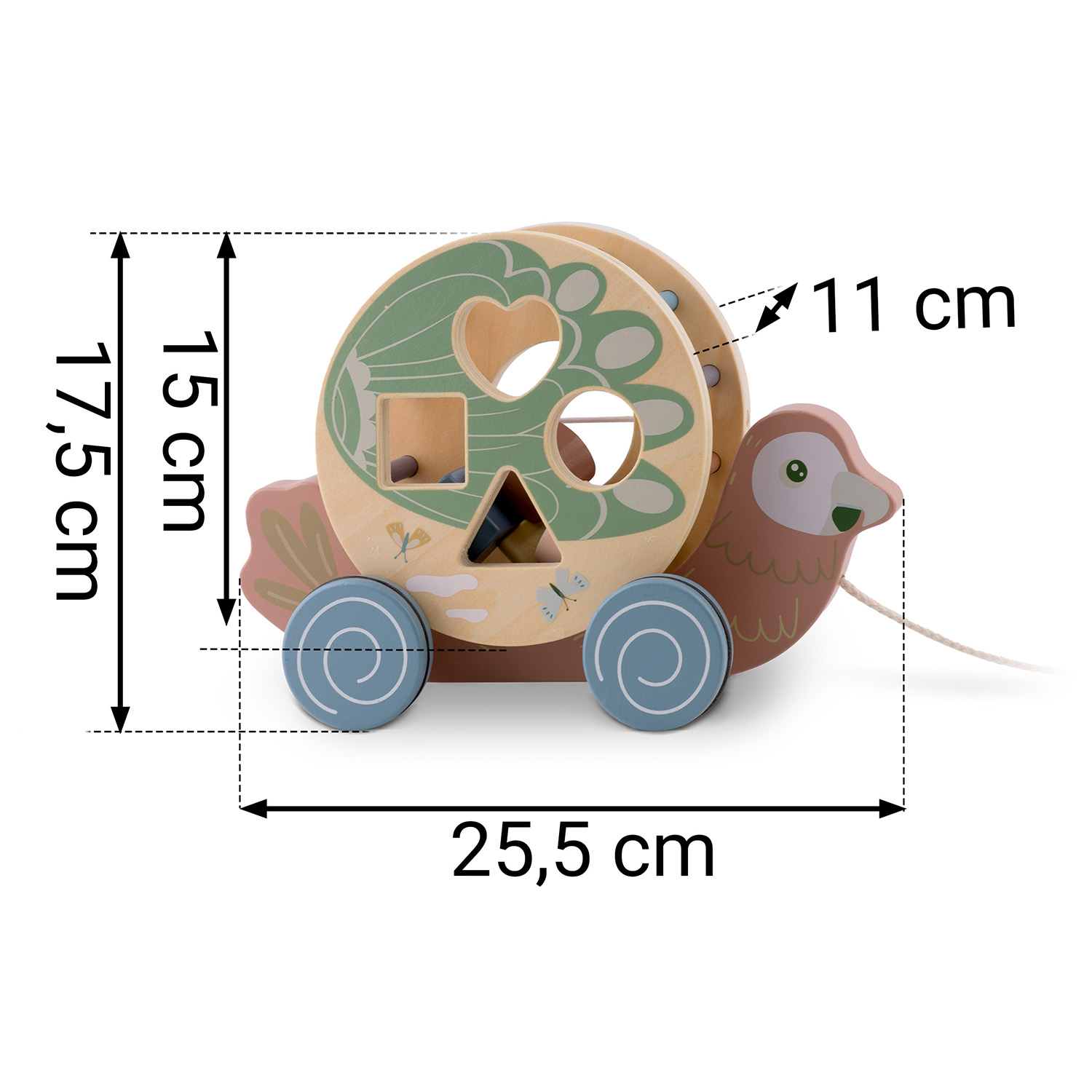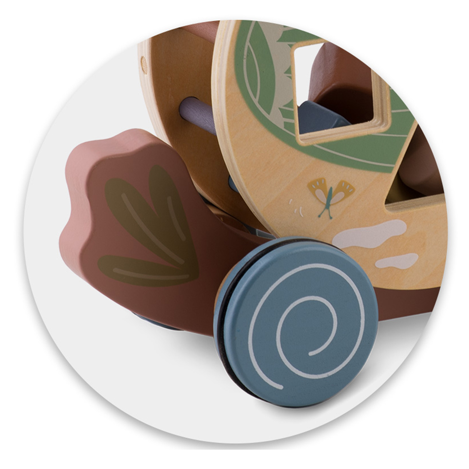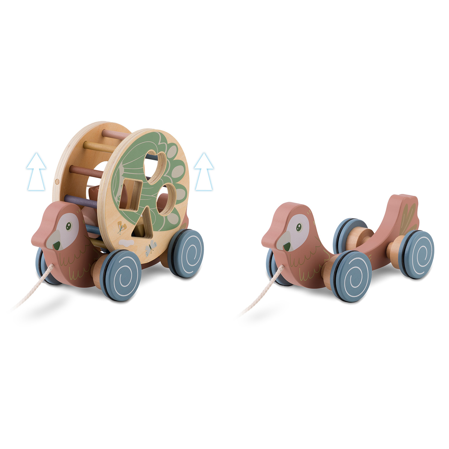 Ciągnięta za sznurek zabawka zaczyna toczyć się, sorter obraca się, a zabawki lekko grzechoczą