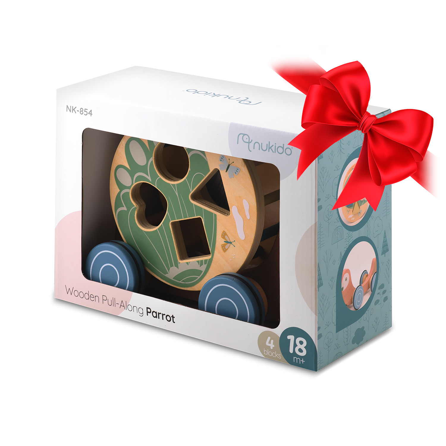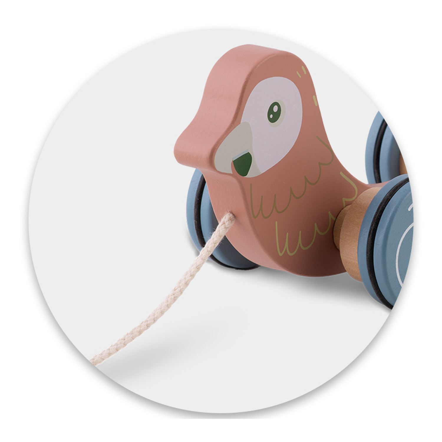 - Papuga do ciągnięcia: drewniana papuga na kółkach, którą dziecko może ciągnąć za pomocą sznurka. Idealna do rozwijania umiejętności motorycznych.