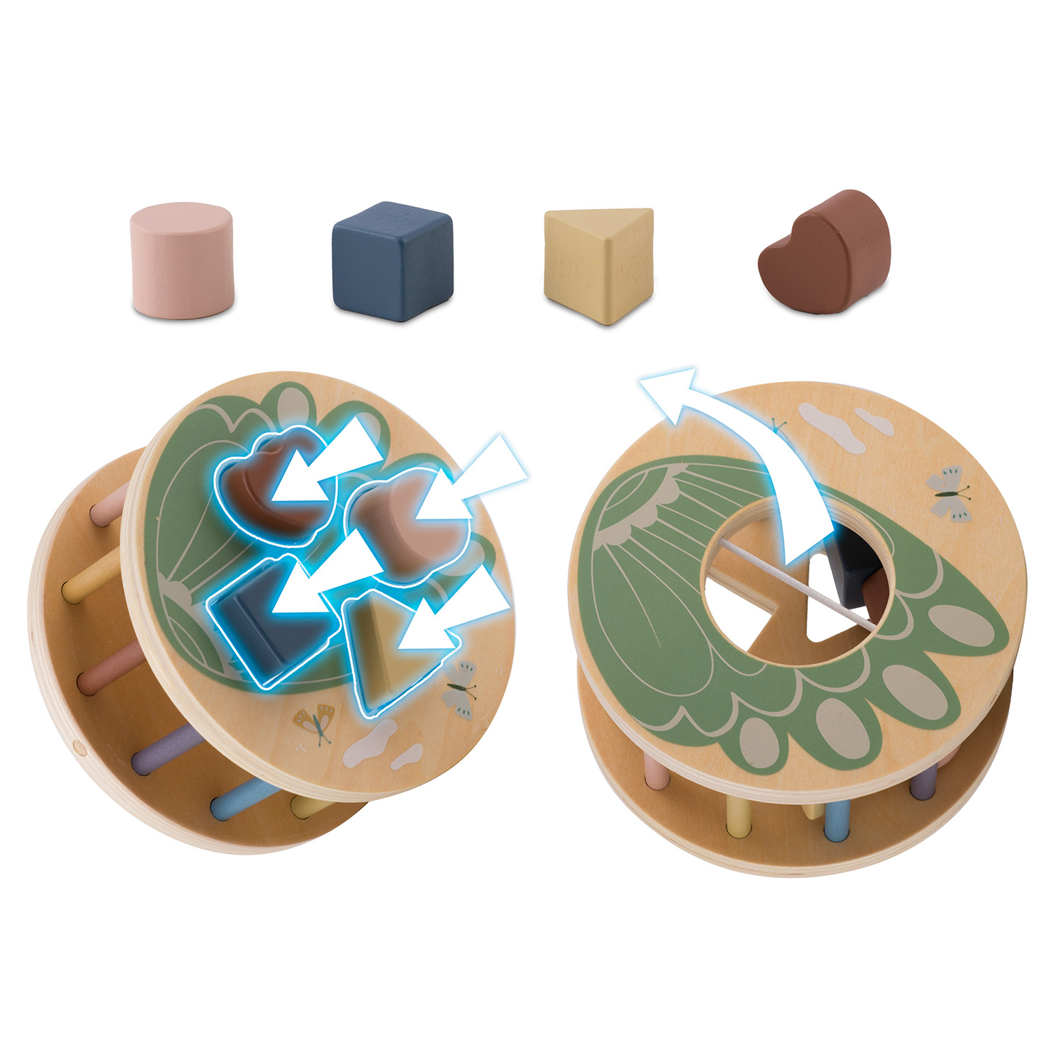 - Obrotowa tarcza dodaje elementu wyzwania i innowacji do tradycyjnej zabawki typu sorter kształtów. Dziecko musi nie tylko dopasować kształt, ale także obracać tarczę, aby znaleźć odpowiedni otwór, co może przyczyniać się do lepszego planowania i umiejętności rozwiązywania problemów.