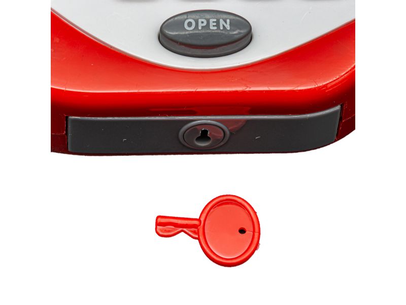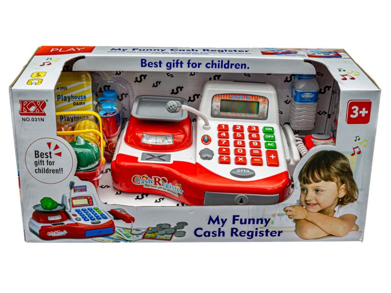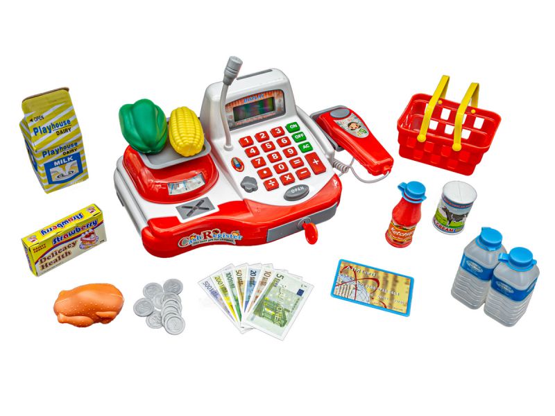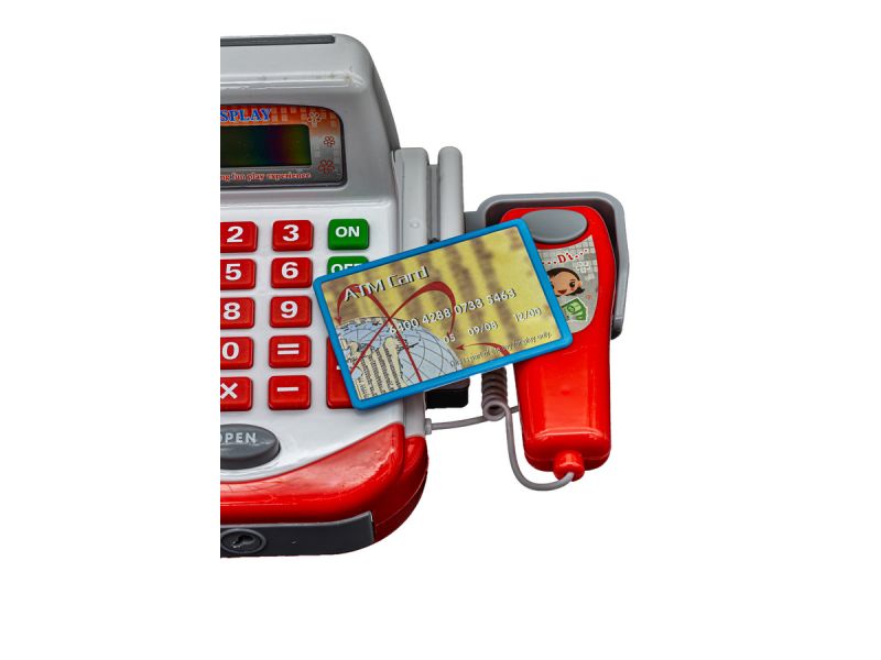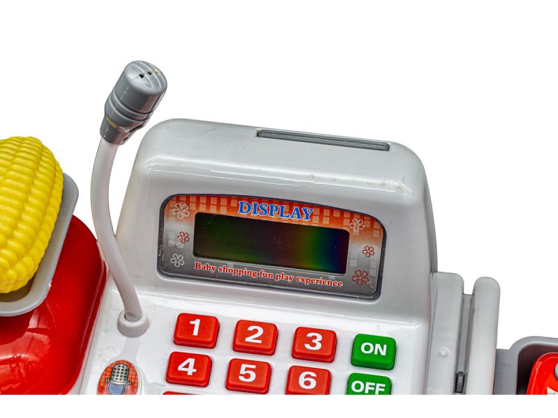 Kasa sklepowa pełna niespodzianekKasa posiada działający mikrofon oraz wbudowany kalkulator. Dodatkowo znajdziesz tutaj również czytnik kodów jak w prawdziwym sklepie. Aby zamknąć rachunek należy nacisnąć przycisk =. Po podsumowaniu zakupów przychodzi czas na zapłatę. |