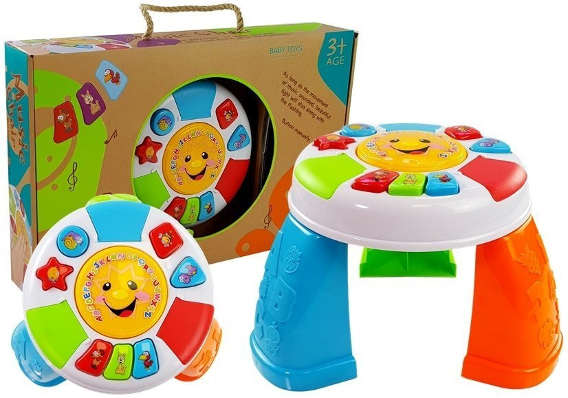 Na blacie stoliczka znajdziemy przyciski w kształcie Trójkąta, kwadratu, koła i gwiazdki uruchamiają wesołe dźwięki. W centralnej części znajduje się duży okrągły przycisk ze słoneczkiem, po naciśnięciu którego usłyszymy śmiech oraz odgłosy i melodie perkusji. Tuż przy krawędzi mamy mini pianinko z trzema przyciskami ze zwierzakami.