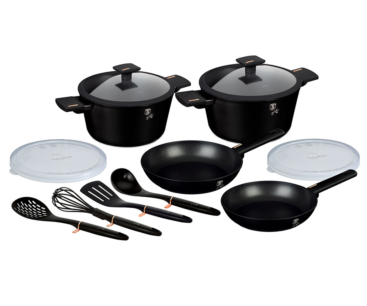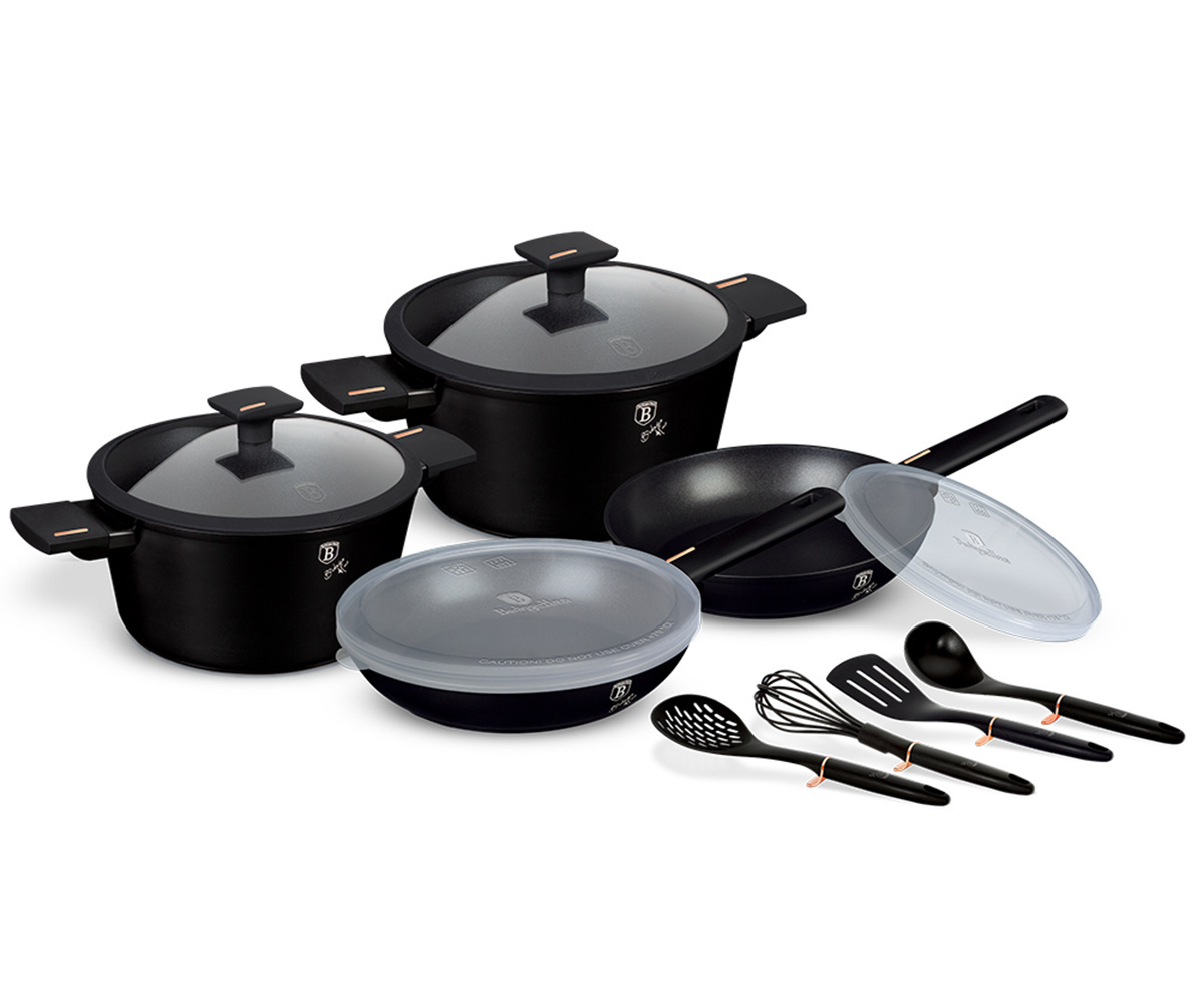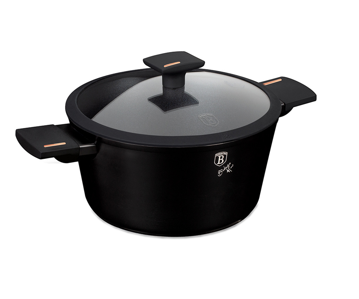 Garnki, patelnie i akcesoria z serii MONACO TITAN COLLECTION firmy BERLINGER HAUS wykonane są z wysokiej klasy kutego aluminium pokrytego wewnątrz powłoką tytanową o bardzo wysokim współczynniku twardości. Powłoka zewnętrzna w kolorze czarnym matowym. Te atrakcyjne i modne naczynia wyposażone są standardowo w uchwyty typu SOFT TOUCH (silikon handle). Przystosowane do wszystkich rodzajów kuchenek: gazowa, elektryczna, ceramiczna, halogenowa, indukcyjna. System TURBO INDUCTION (bardzo szybko nagrzewają się) pozwala zaoszczędzić nawet 35% energii.