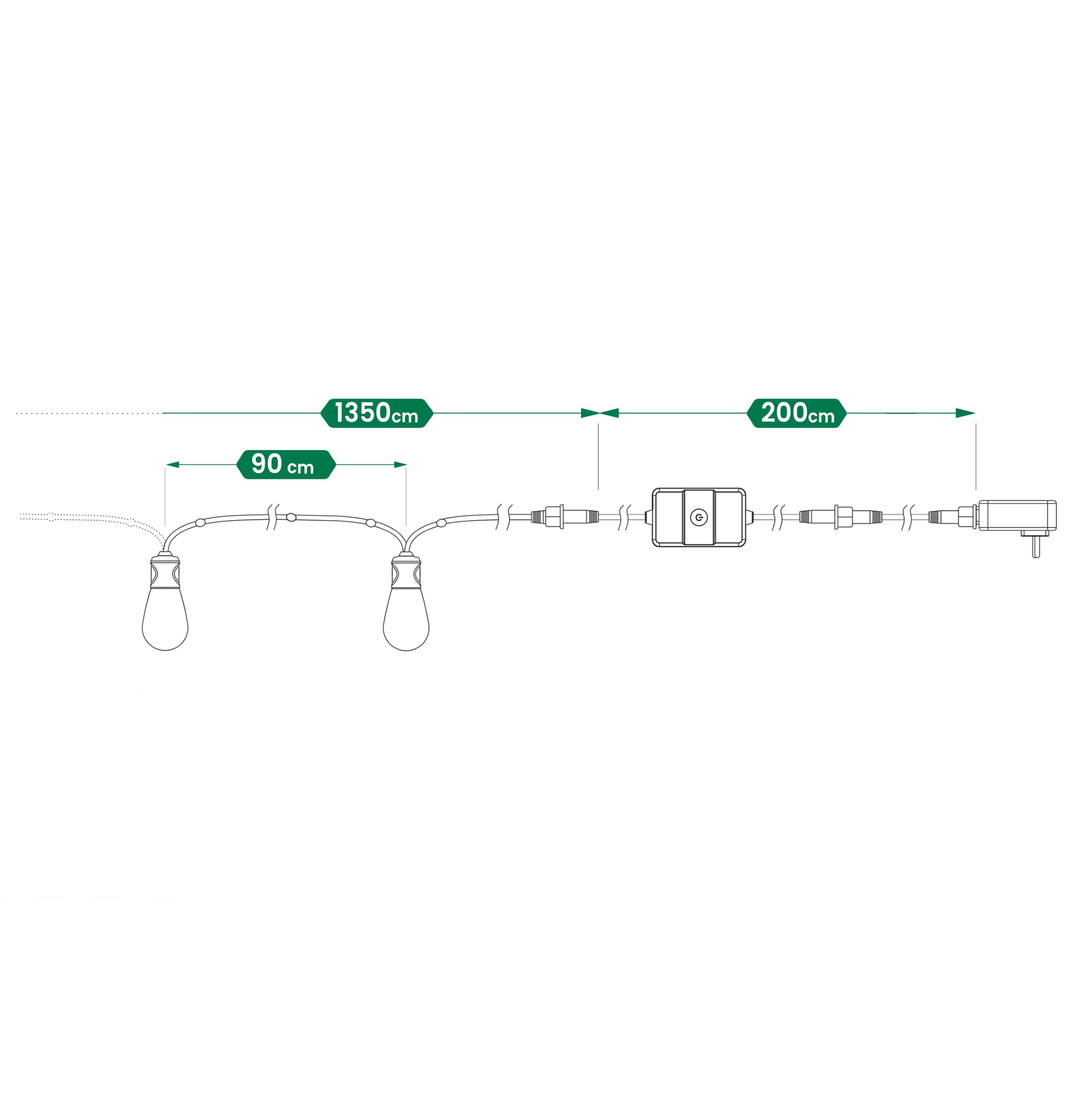 - Odległość między żarówkami: 90 cm