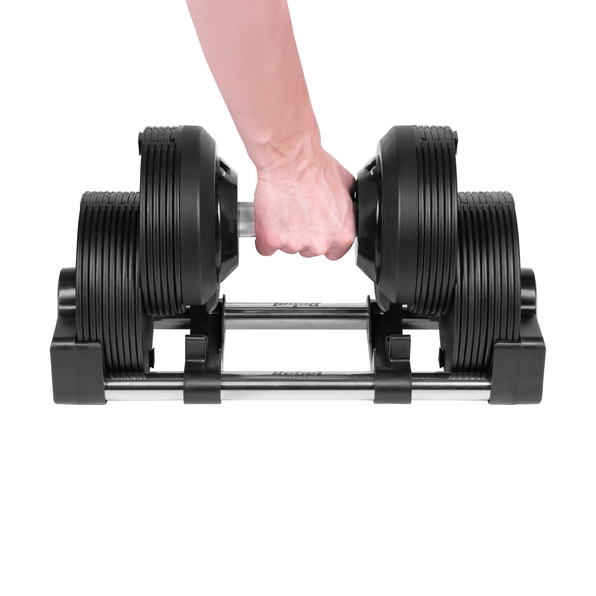 Nowoczesny system regulacji pozwala na automatyczną zmianę obciążenia poprzez prosty obrót uchwytem. Dzięki temu w kilka sekund wybierzesz odpowiednią wagę od 5 do 36 kg, bez konieczności odkręcania talerzy. Z 32 możliwymi ustawieniami dopasujesz intensywność do każdego ćwiczenia. Hantel regulowany Rebel Active pozwala zachować płynność treningu i maksymalną wygodę użytkowania.