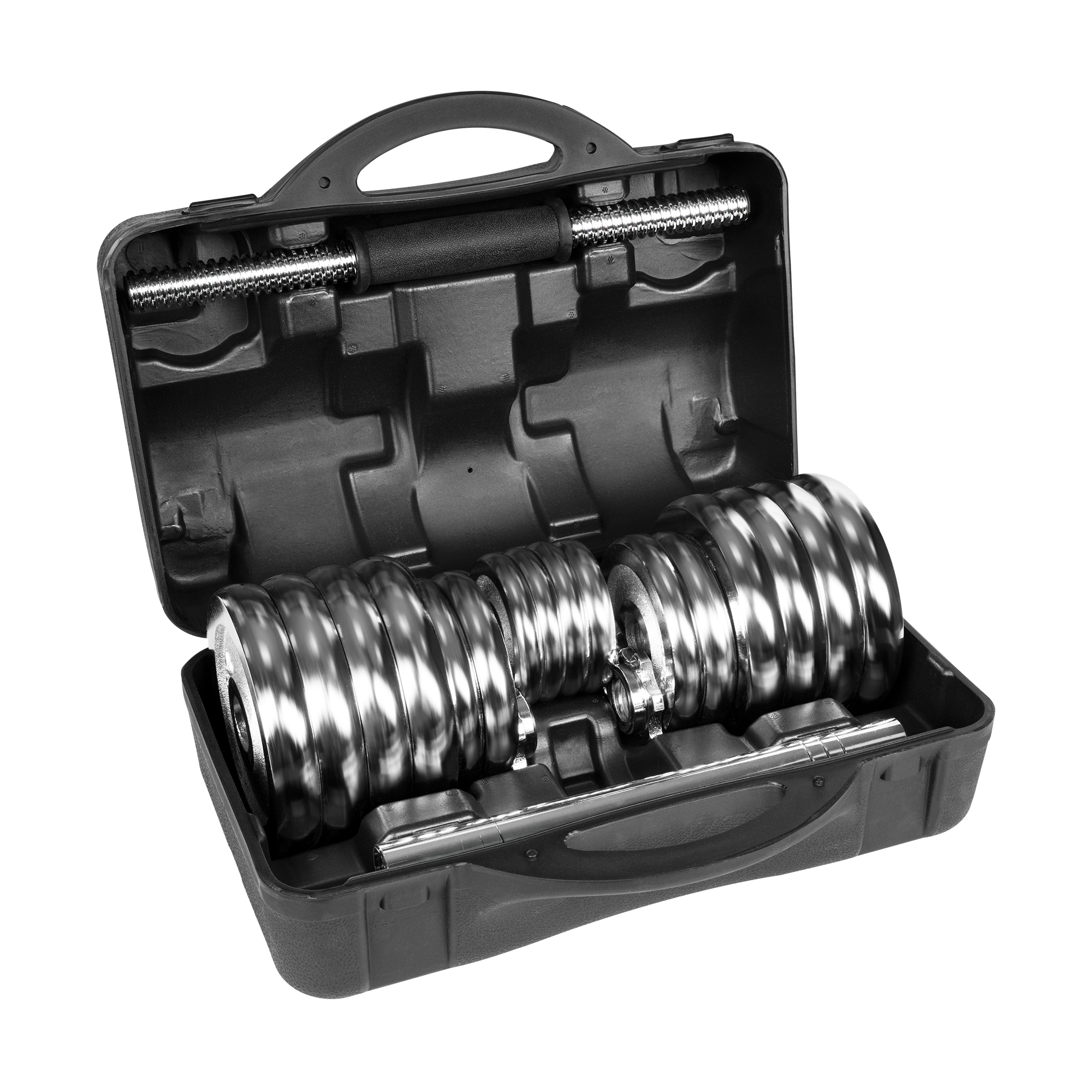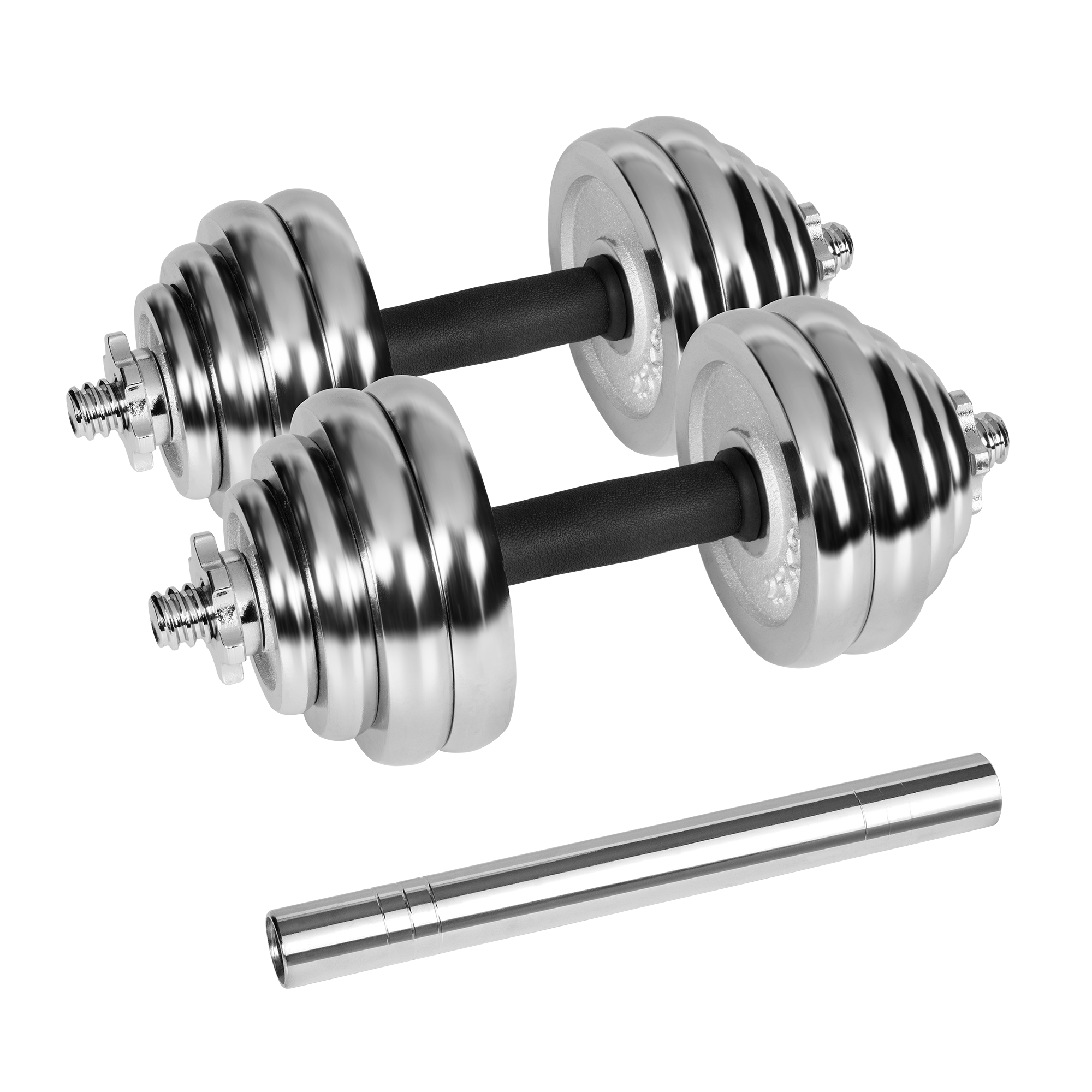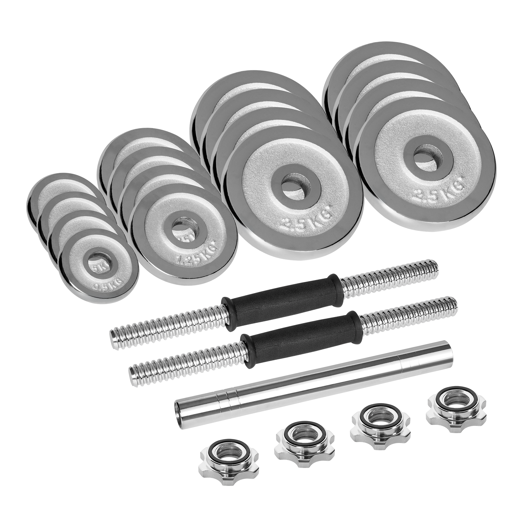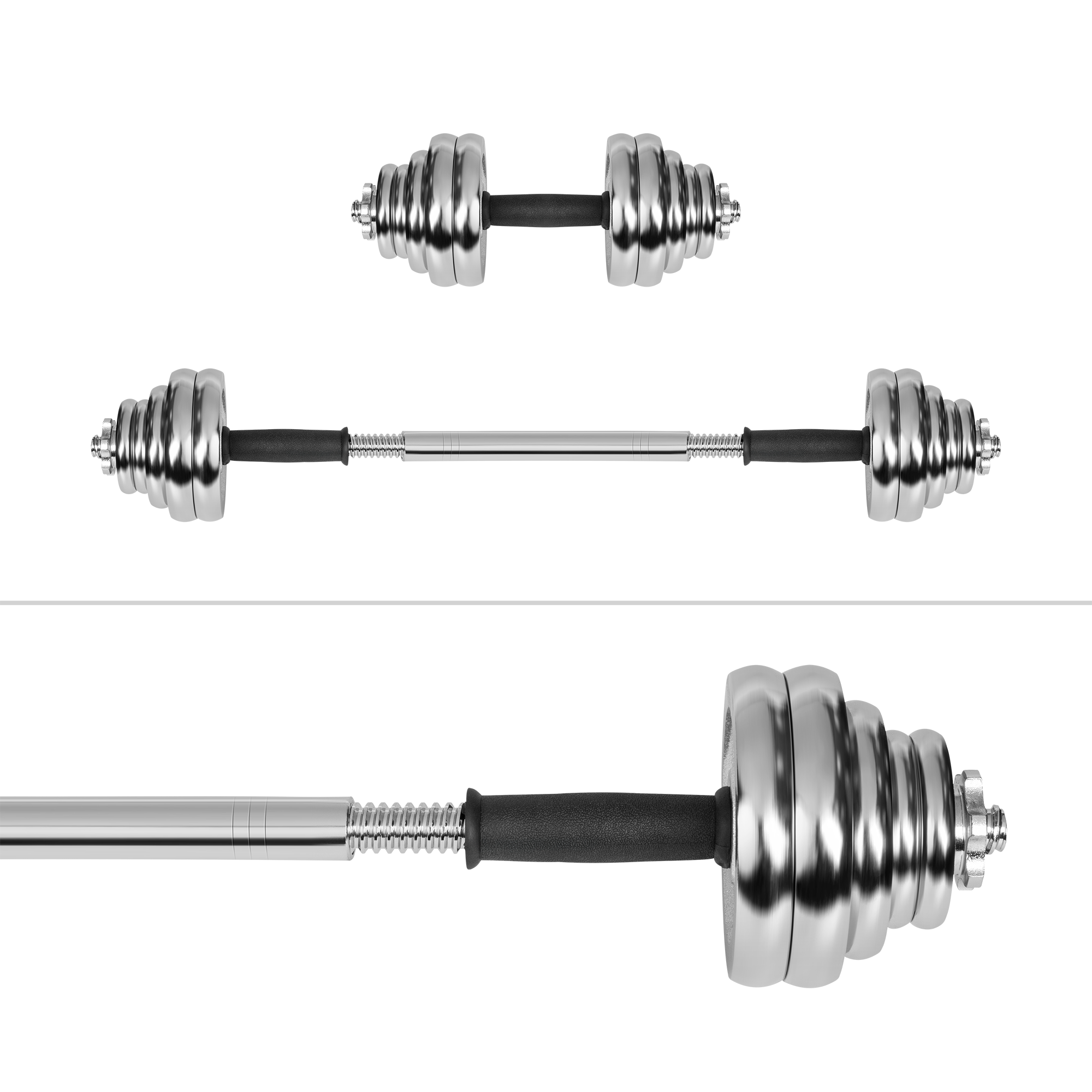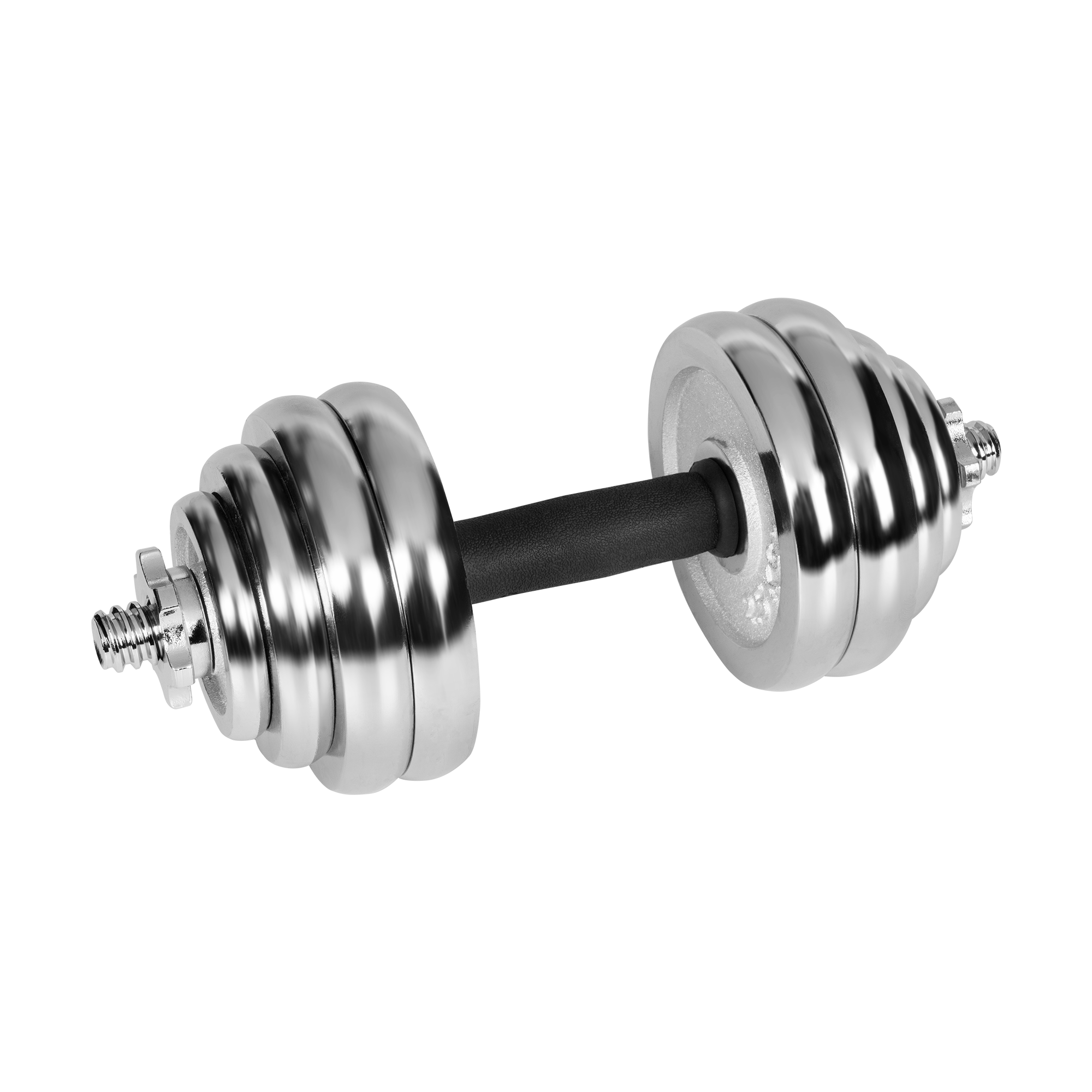 Zestaw wykonany z wysokiej jakości żeliwa, pokrytego trwałą powłoką chromowaną, która zabezpiecza przed korozją, zarysowaniami i uszkodzeniami mechanicznymi. Chrom nadaje hantlom elegancki wygląd i zwiększa ich żywotność, nawet przy intensywnym użytkowaniu.