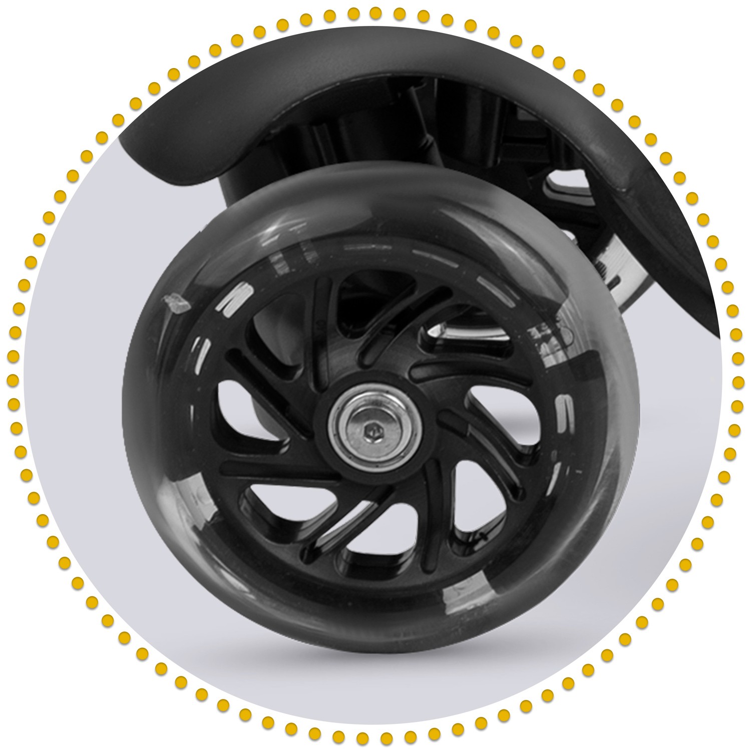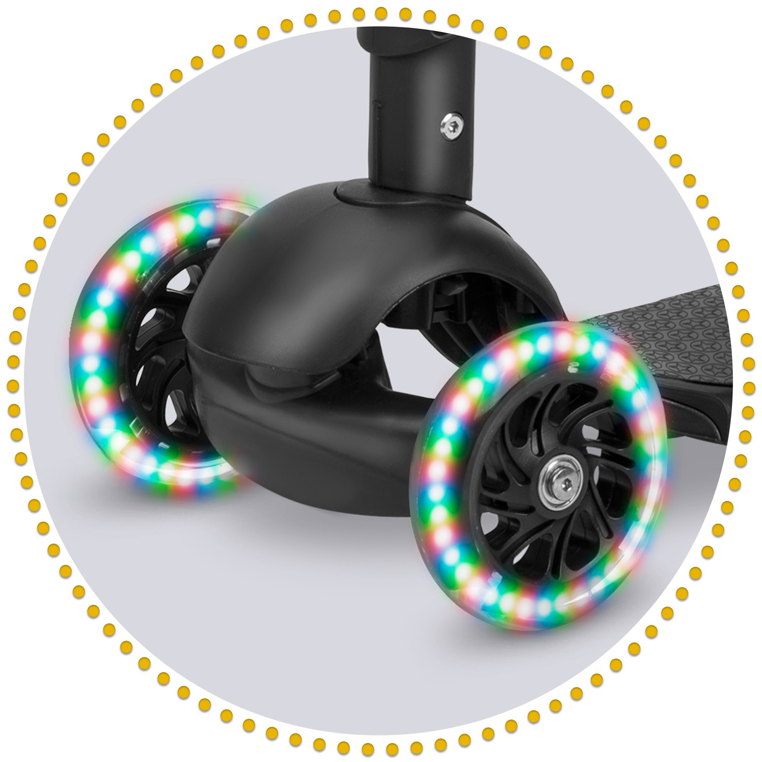 - świetna zabawa! Hulajnoga posiada wbudowane dynamo — dzięki czemu kółka świecą się podczas jazdy!