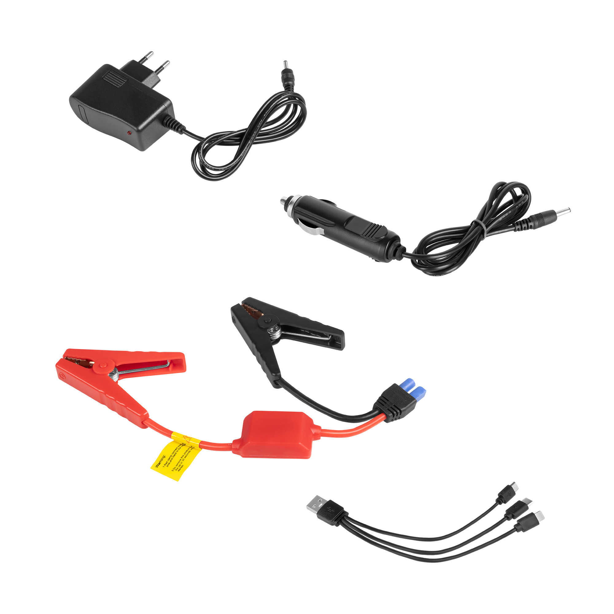 W zestawie: przewody rozruchowe, kabel 3 w 1 (Micro USB, USB-C, Lightning), ładowarka samochodowa, ładowarka sieciowa, instrukcja obsługi