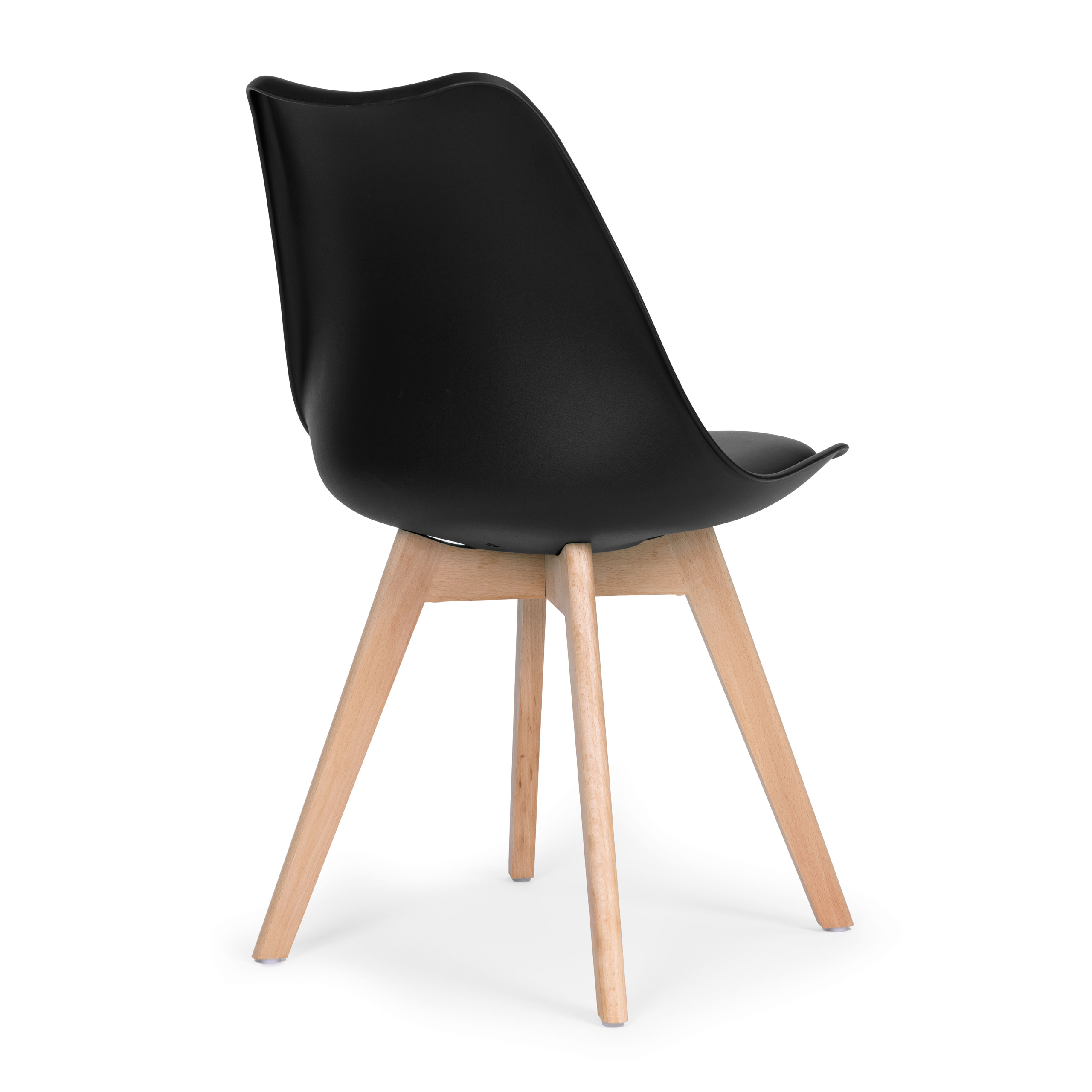Połączenie bukowych nóg z elegancką poduszką z ekoskóry nadaje krzesłu nowoczesny, ale jednocześnie przytulny wygląd.
