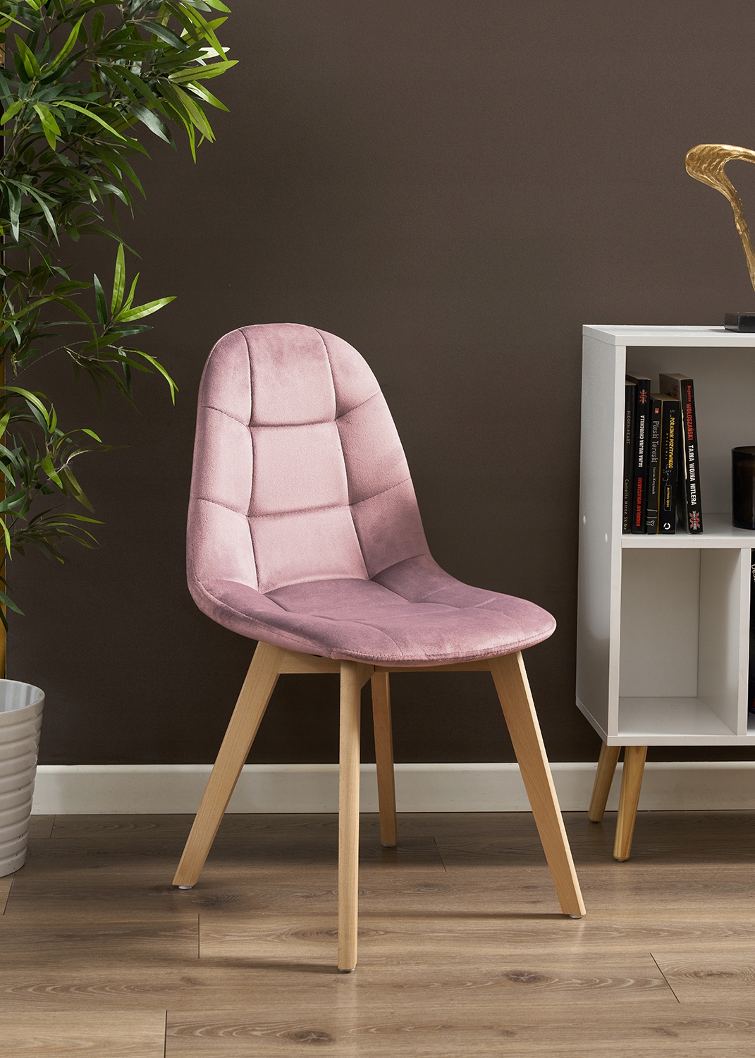 ➡️ Posiada miękkie i trwałe siedzisko pokryte aksamitnym w dotyku welurem. Wyściełane jest grubą warstwą wypełnienia, a jego oparcie wyróżnia się komfortowym wyprofilowaniem, które doskonale podtrzymuje plecy. Drewniane nogi wykonane z buku o jego jasnym odcieniu zapewniają stabilność oraz wytrzymałość.