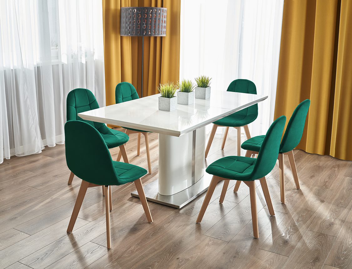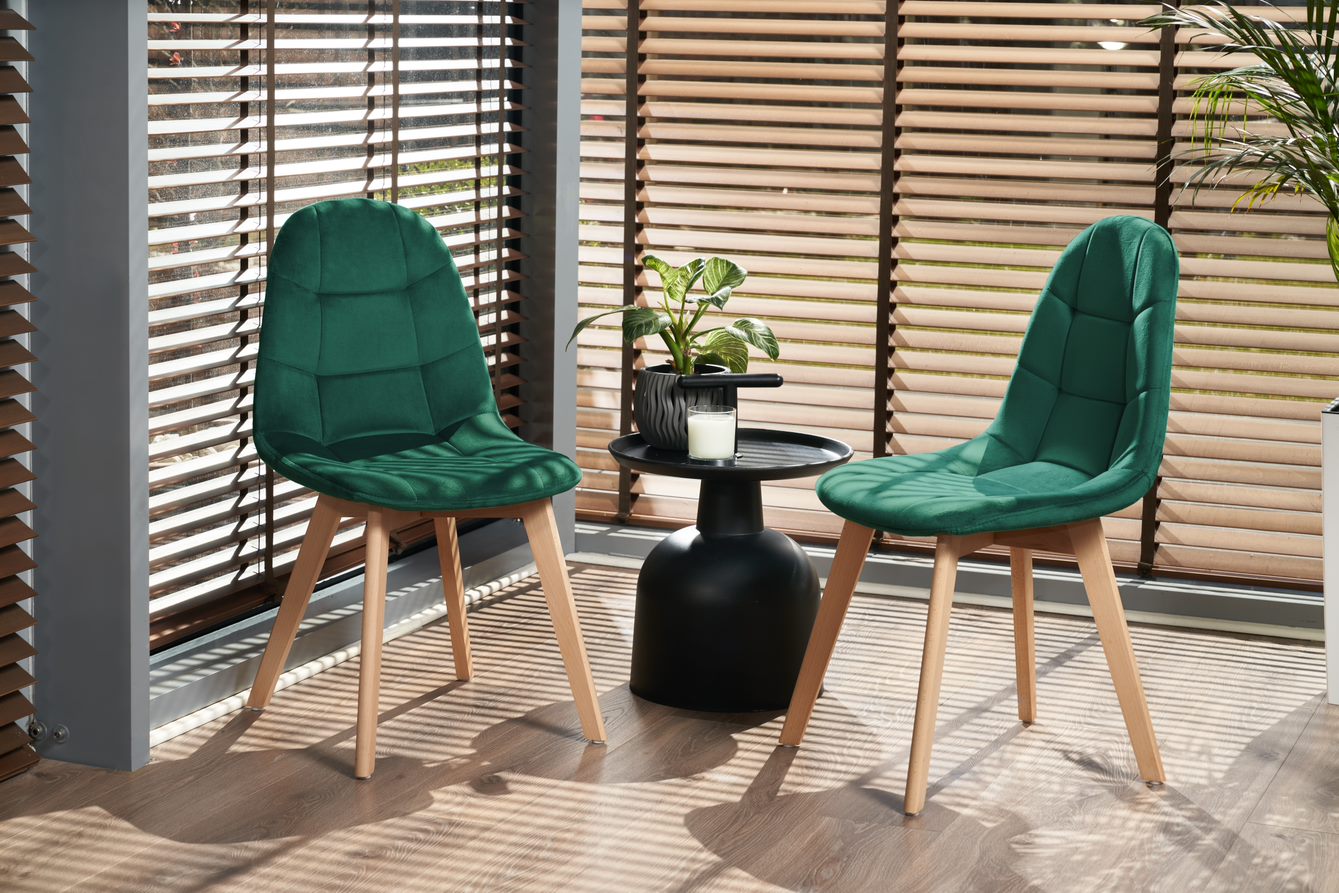 ➡️ Posiada miękkie i trwałe siedzisko pokryte aksamitnym w dotyku welurem. Wyściełane jest grubą warstwą wypełnienia, a jego oparcie wyróżnia się komfortowym wyprofilowaniem, które doskonale podtrzymuje plecy. Drewniane nogi wykonane z buku o jego jasnym odcieniu zapewniają stabilność oraz wytrzymałość.