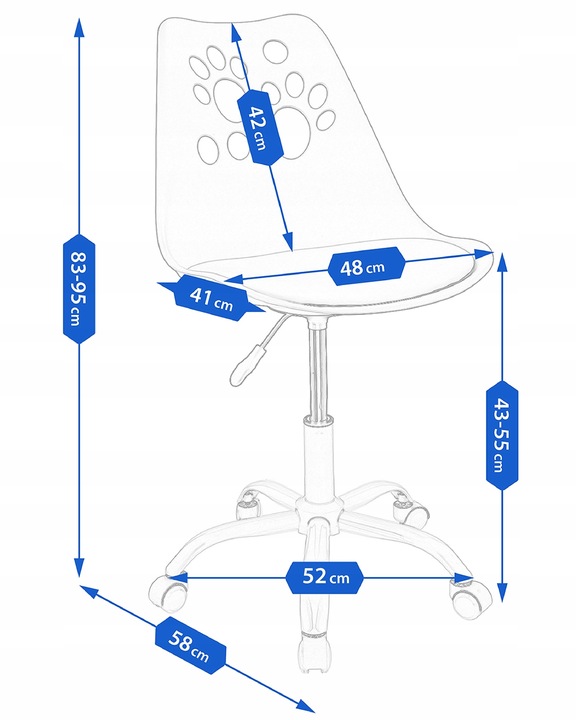 ➡️ Idealnie wyprofilowane oparcie z motywem psich łapek w połączeniu z miękką poduszką umieszczoną na siedzisku zapewnia wygodę, a pięcioramienna podstawa zakończona niewielkimi kółkami daje dużą stabilność oraz zabezpiecza powierzchnię przed zarysowaniem. Krzesło posiada siłownik, który pozwala dostosować wysokość siedzenia do wymaganych potrzeb.