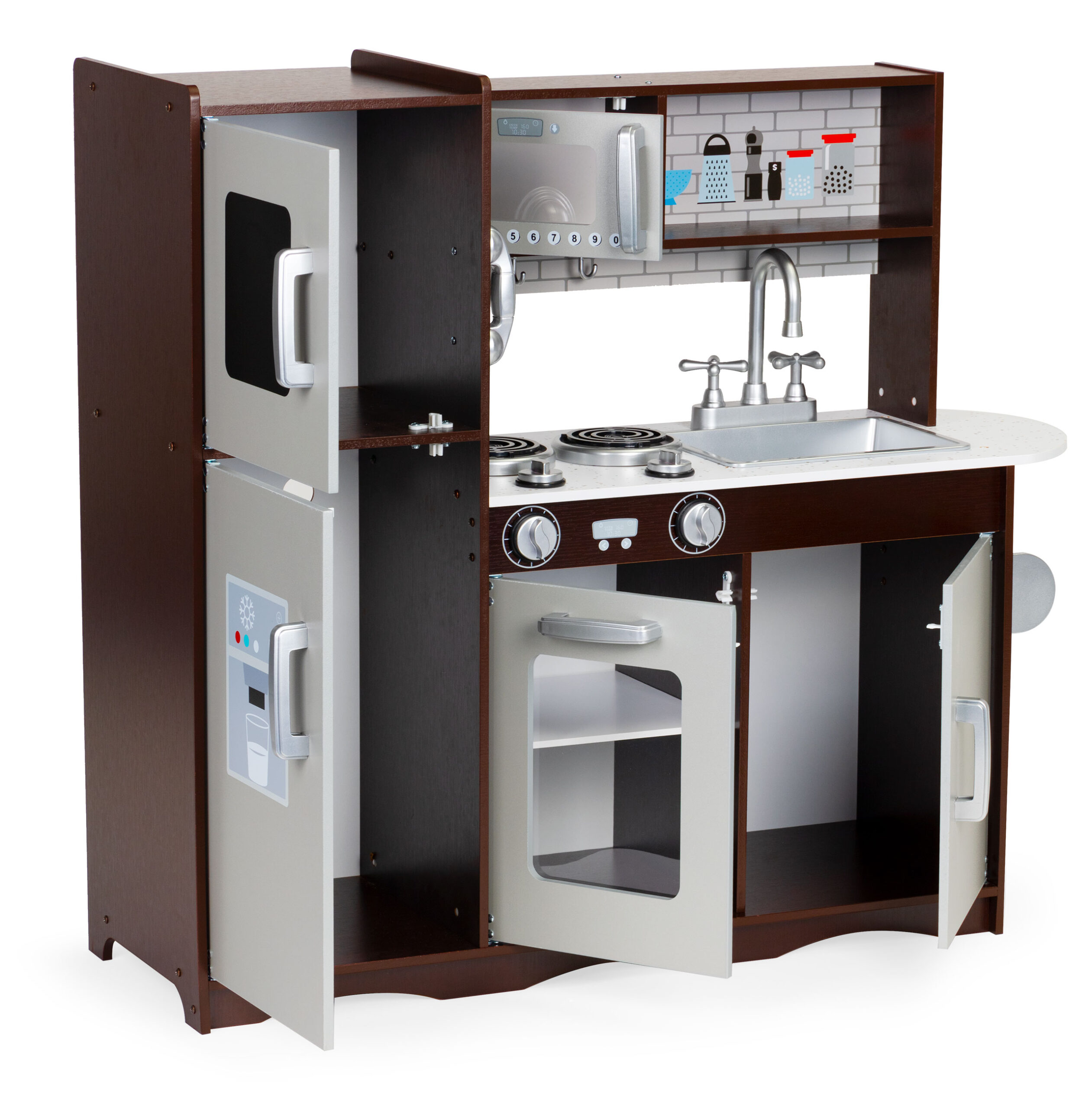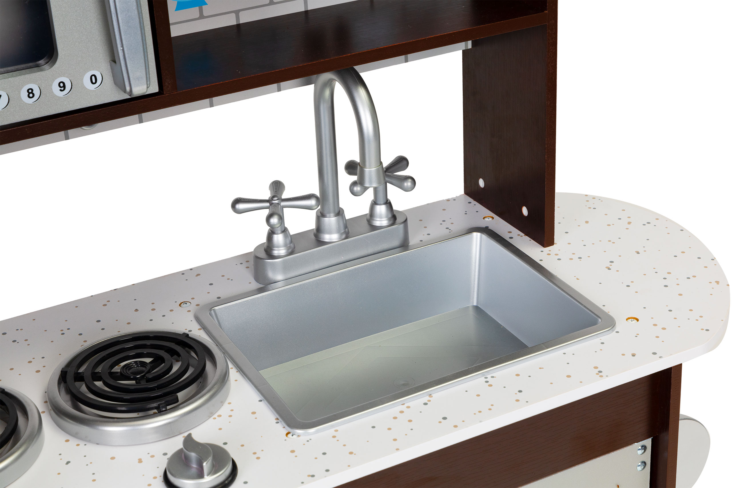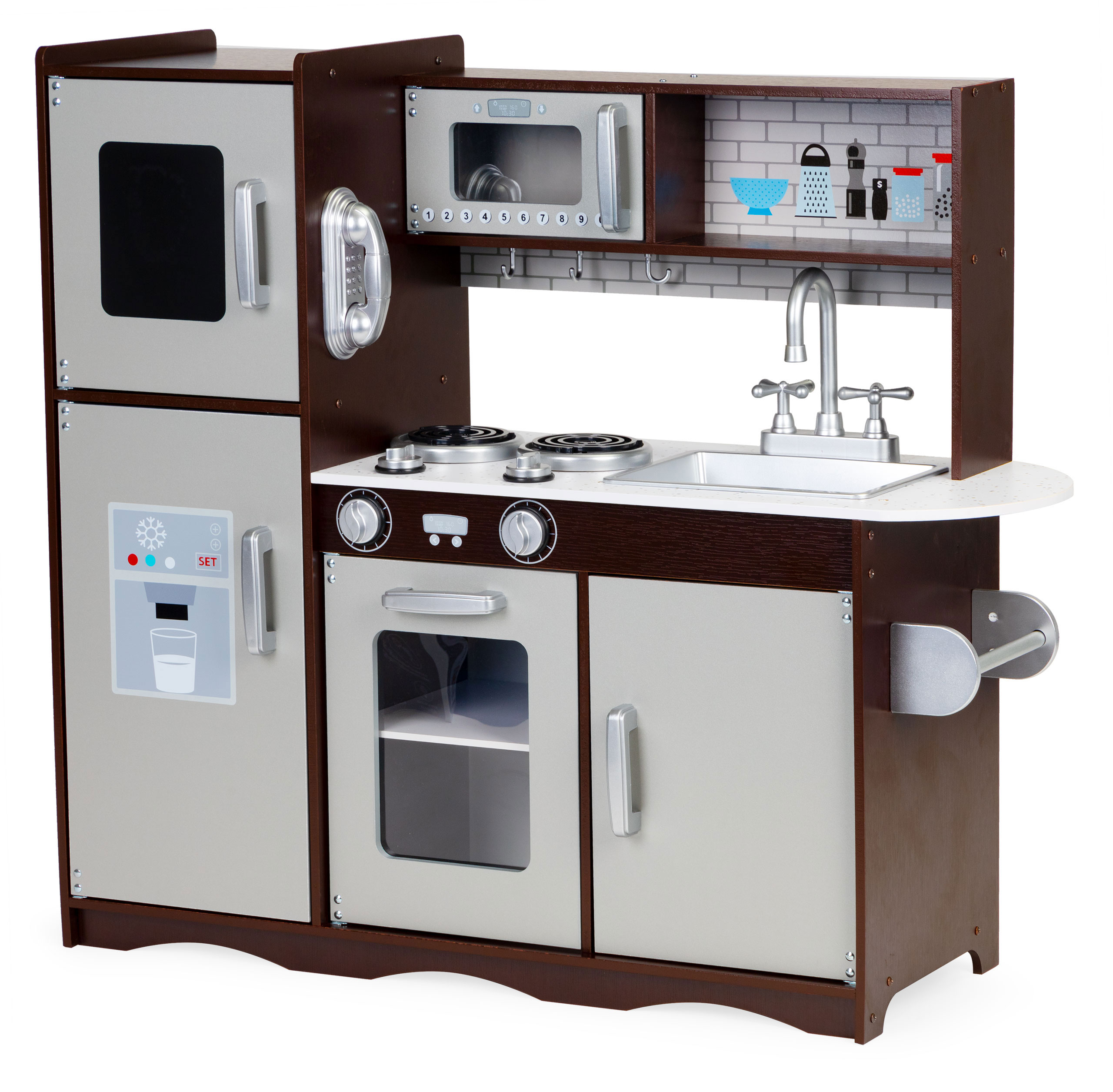 Mały kucharz może równocześnie piec, gotować oraz podgrzewać danie w mikrofali. Po skończonym gotowaniu wszystkie naczynia można umyć w pojemnym zlewie i odstawić przybory na swoje miejsca.