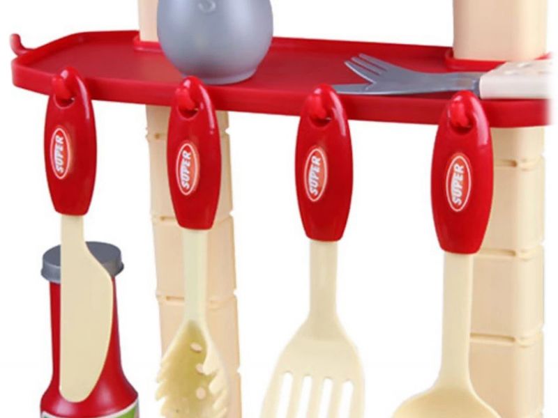 Kuchnia posiada również wbudowany zlewozmywak z kranem, półeczki, zawieszki na przybory i akcesoria kuchenne. Po skończonej zabawie należy wszystko umyć, wytrzeć i odłożyć na miejsce – to idealny sposób, by poprzez zabawę nauczyć dziecko utrzymywania ładu w miejscu zabawy.