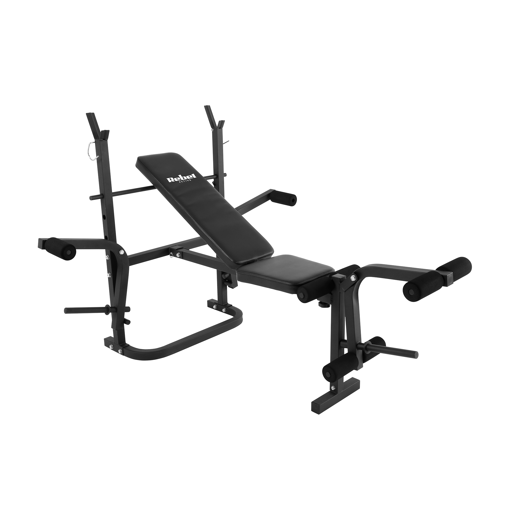 Wielofunkcyjna ławka treningowa Rebel Active z obciążeniem rozpiętek do 25 kg pozwala na efektywne rozwijanie mięśni klatki piersiowej i ramion. Z kolei przyrząd do ćwiczeń nóg z takim samym obciążeniem umożliwia skoncentrowane treningi dolnych partii ciała.