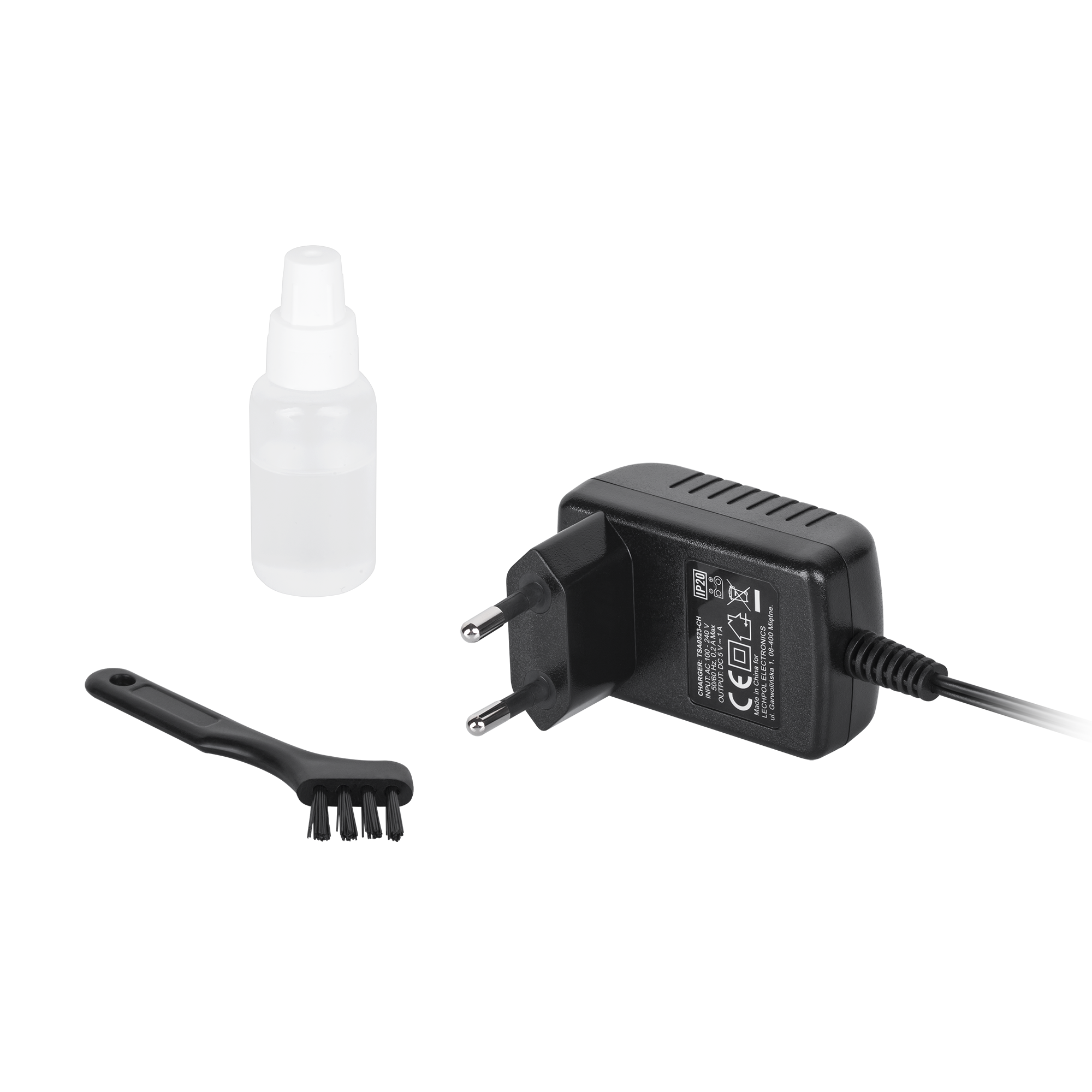 W zestawie: ładowarka sieciowa, stacja ładująca, 4 nasadki grzebieniowe, szczotka do czyszczenia, olejek do konserwacji, instrukcja obsługi