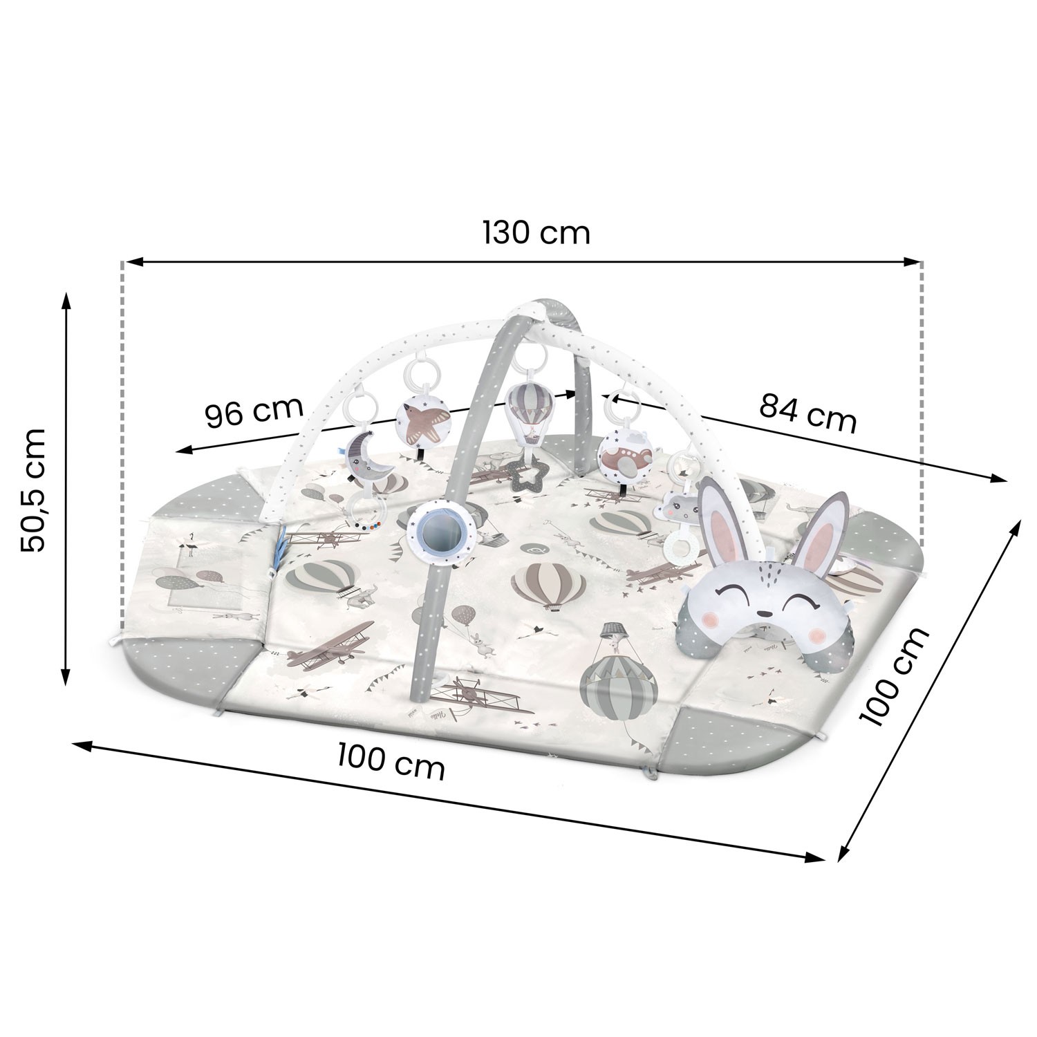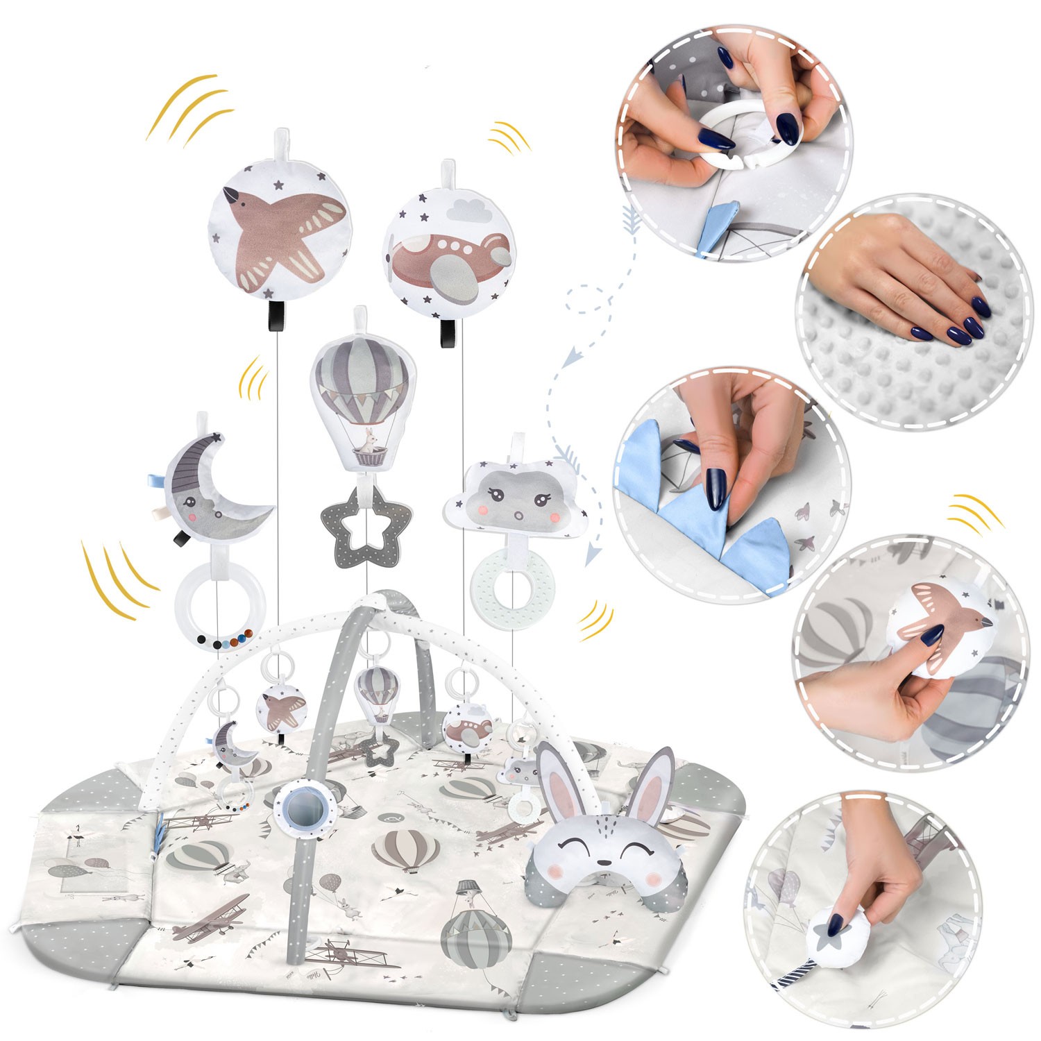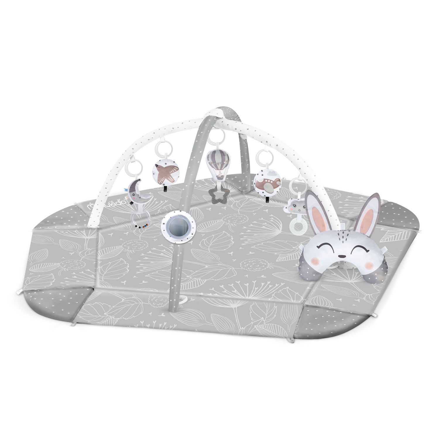 • zestaw zawiera: matę, 5 ścianek, 2 pałąki, 7 wielofunkcyjnych zabawek w tym GRATIS poduszkę do leżenia na brzuchu,