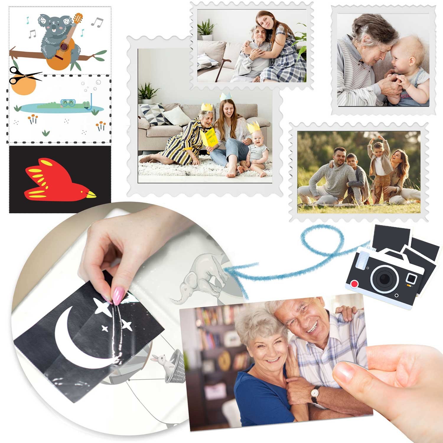 Solidnie wszyte kieszonki w które wsuniesz zdjęcia, rysunki lub dowolne obrazki. W zestawie dostajesz 4 ilustracje, które możesz wyciąć z opakowania – ekologia i praktyczność w jednym.