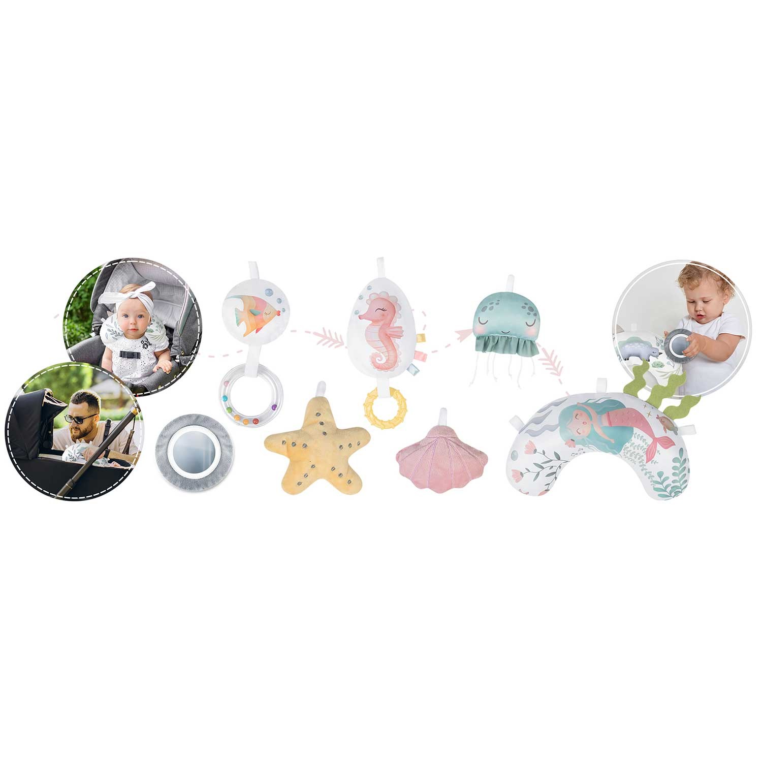To właśnie dlatego do maty dołączamy multifunkcyjne zabawki, które możesz zwiesić na pałąkach — niech coś zagrzechocze, zadzwoni, a coś zaszeleści! Wśród zabawek jest nawet zabawka piszcząca — krab!