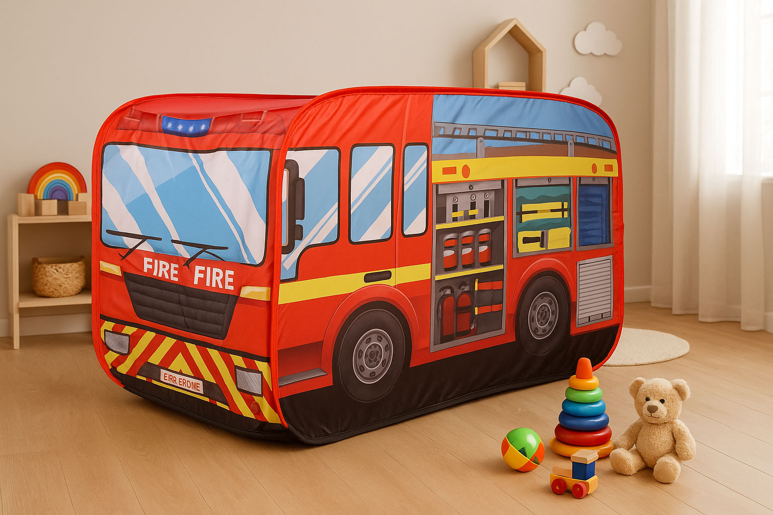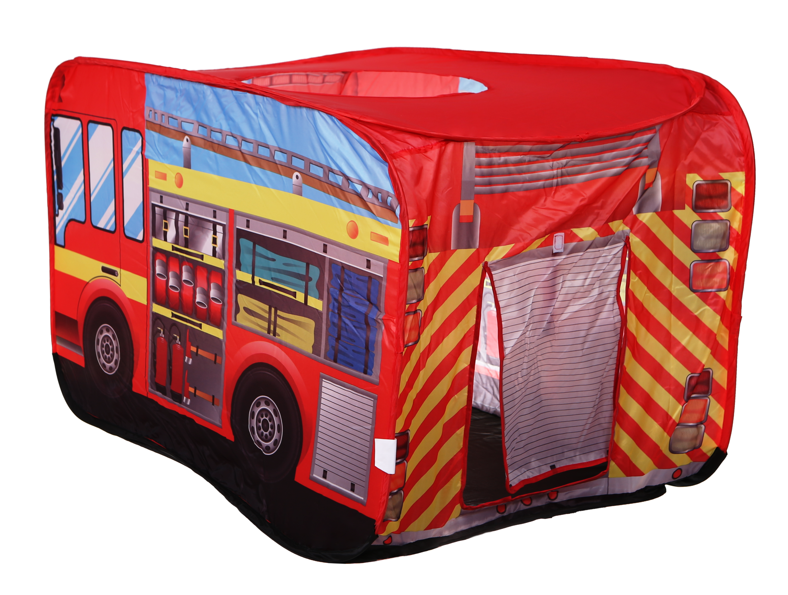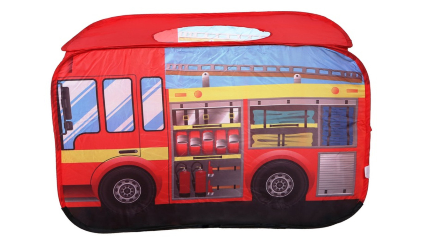 Produkt kształtem przypomina wóz strażacki – posiada wyjście w dachu aby dziecko mogło symulować gaszenie pożaru. Namiot jest praktyczny oraz łatwy w montażu. Dzięki lekkiemu stelażowi łatwo przenieść go z miejsca na miejsce.