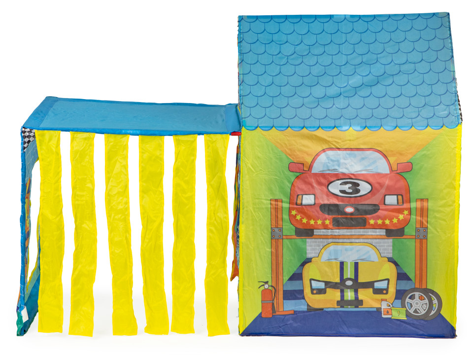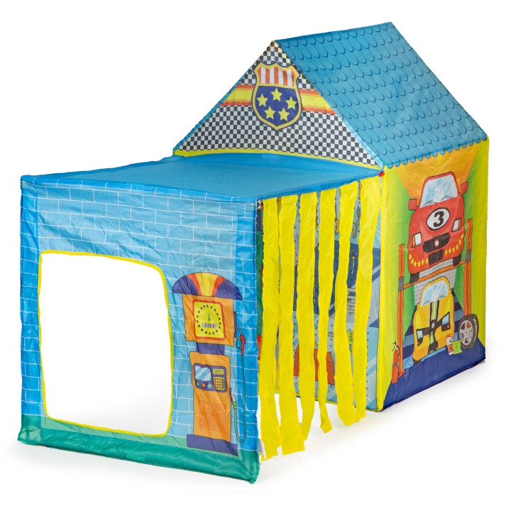 Namiocik składa się z domku i połączonego z nim zadaszenia, wszystko przypomina warsztat samochodowy, myjnię i stację benzynową. Każdy mały miłośnik motoryzacji będzie mógł wcielić się w rolę mechanika, a zabawa nie będzie miała końca.