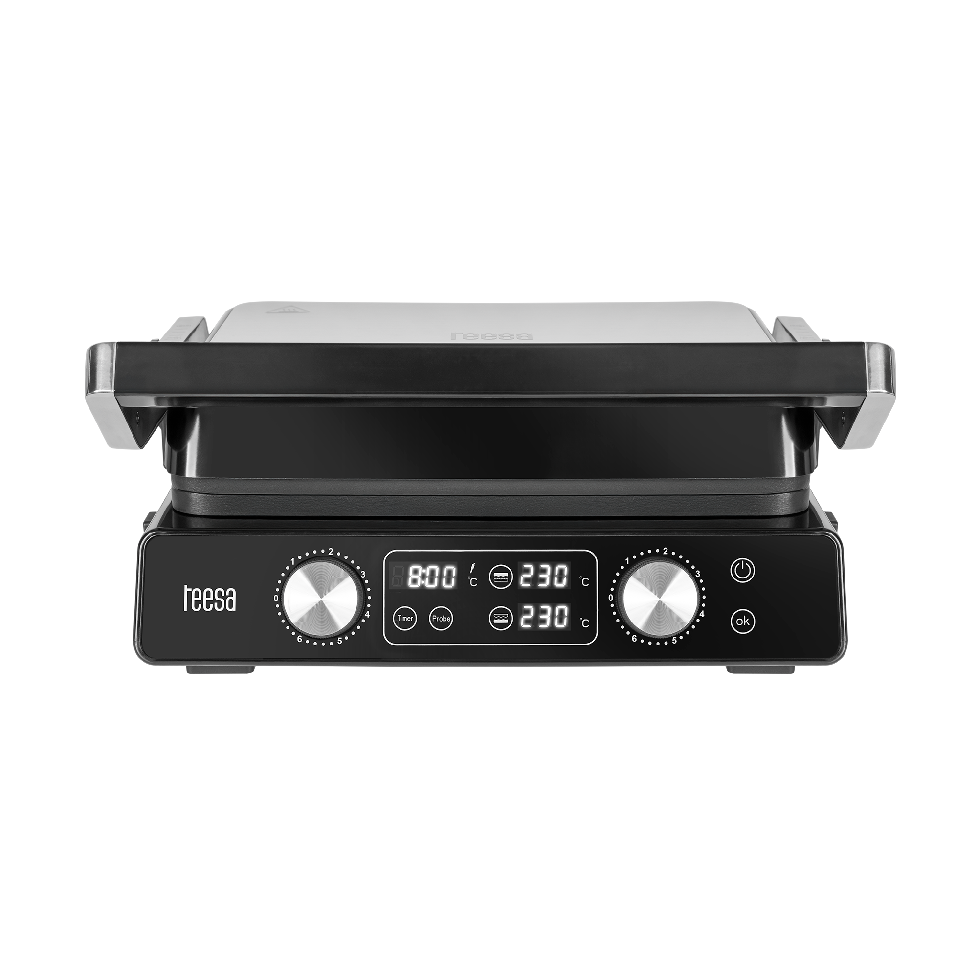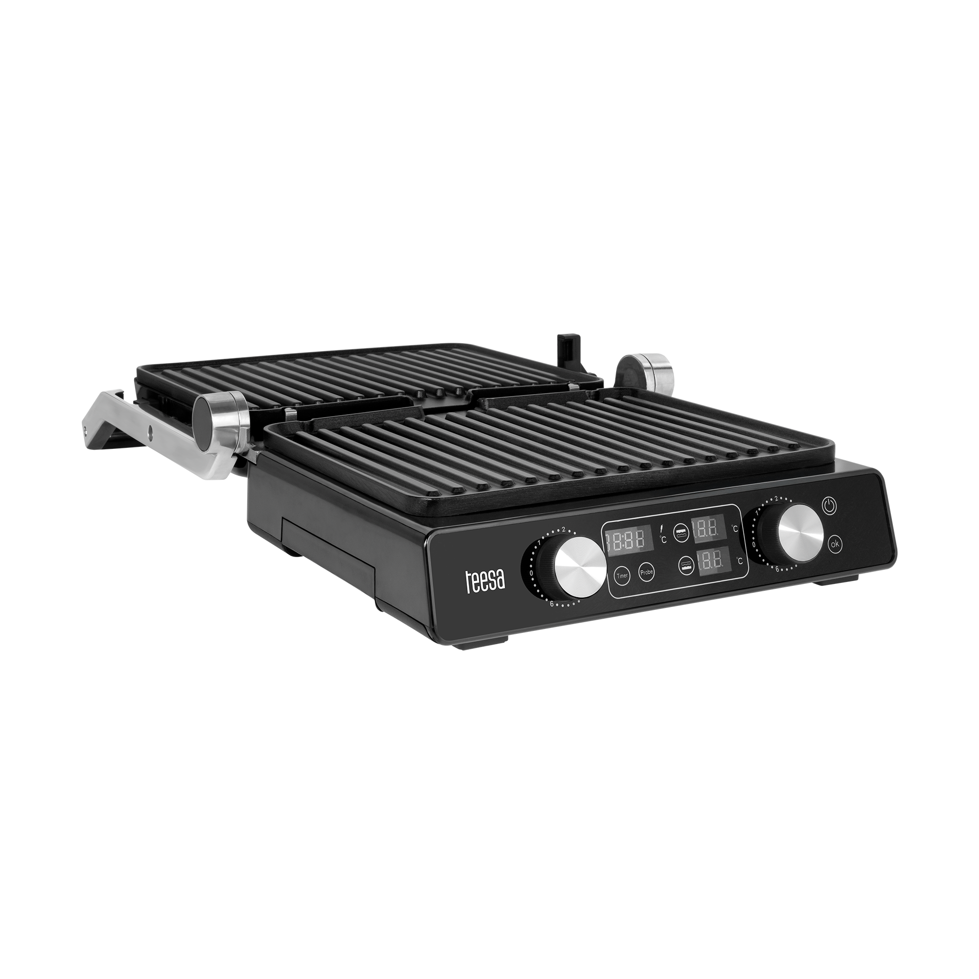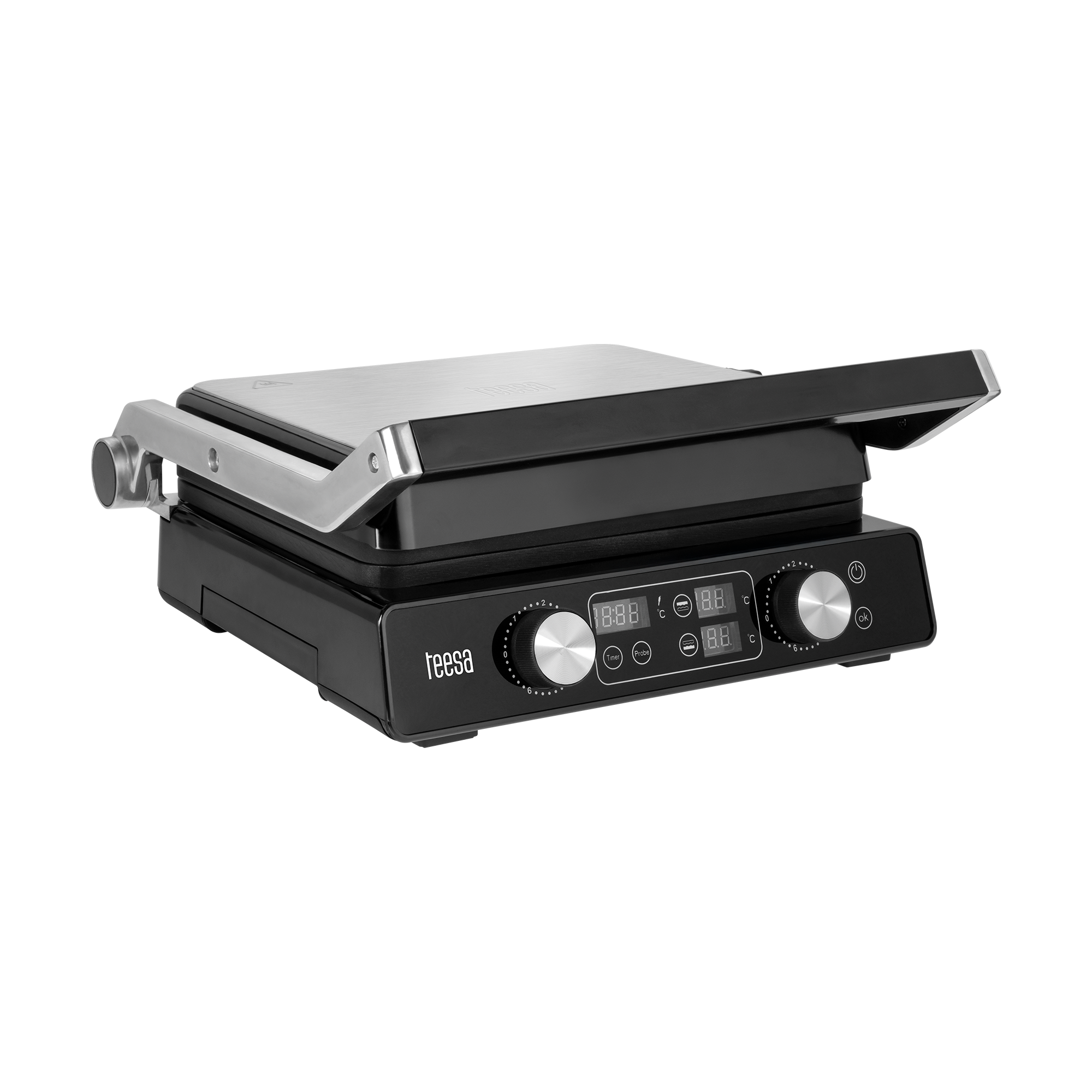 Dzięki aż 7 pozycjom ustawienia płyt, panini grill Teesa pozwala precyzyjnie dopasować tryb grillowania do rodzaju potrawy – od cienkich kromek chleba po wysokie burgery czy warzywne szaszłyki. Możesz używać go jako klasycznego grilla kontaktowego, otwartego grilla stołowego czy opiekacza do kanapek. Regulacja kąta sprawia, że jedzenie jest opiekane równomiernie, a jego tekstura pozostaje idealna.