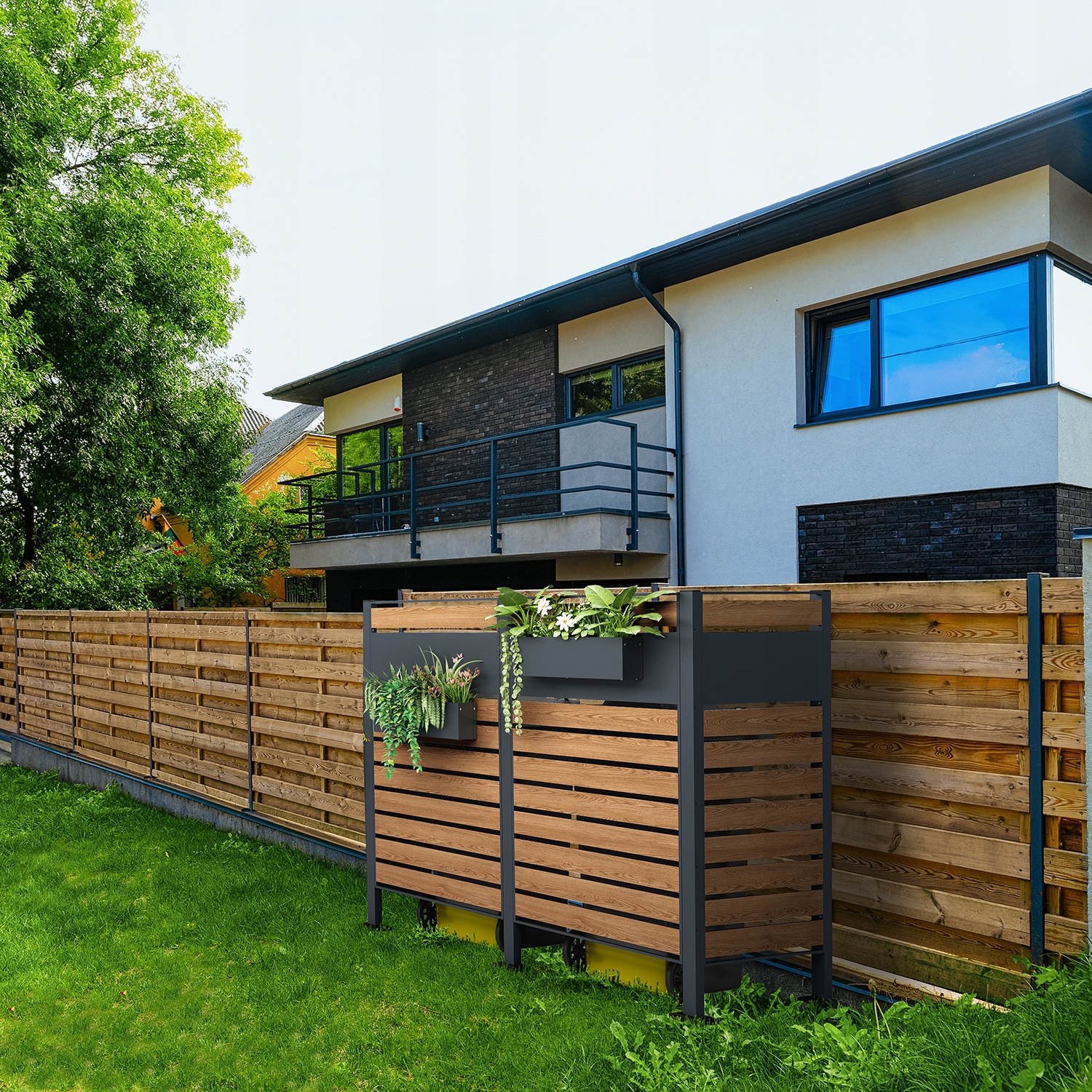 ➡️ Praktyczna a zarazem estetyczna zabudowa na kosz na śmieci, która z powodzeniem może służyć jako osłona do zabudowania tarasu. Stanowi nie tylko dobre zabezpieczenie dla pojemników na odpady, ale i łatwy dostęp do nich.