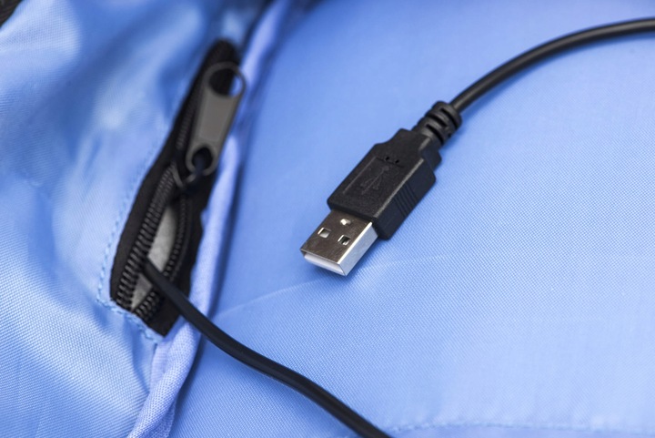 ✅ Wbudowany kabel z wyjściem zewnętrznym. Zestaw pozwala na podłączenie powerbanka wewnątrz plecaka i podłączenie telefonu kablem od ładowarki poprzez wejście USB