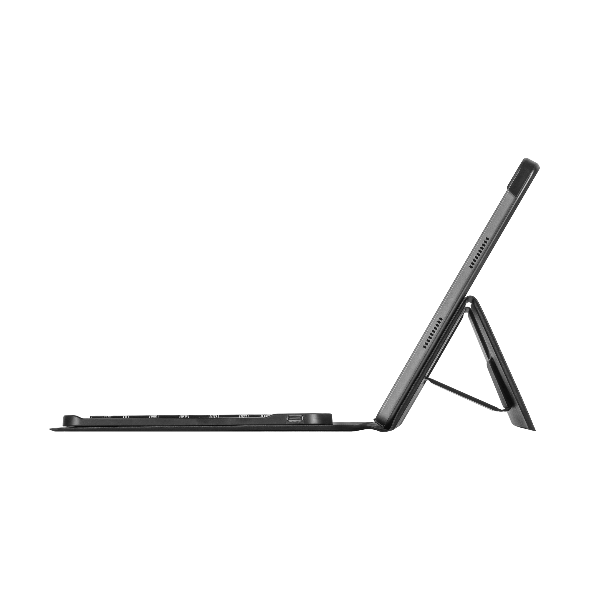 Pokrowiec pełni również funkcję podpórki, umożliwiając ustawienie tabletu pod idealnym kątem do pracy, oglądania filmów lub prowadzenia wideorozmów. Stabilna konstrukcja pozwala na wygodne korzystanie z urządzenia zarówno w domu, jak i w podróży.