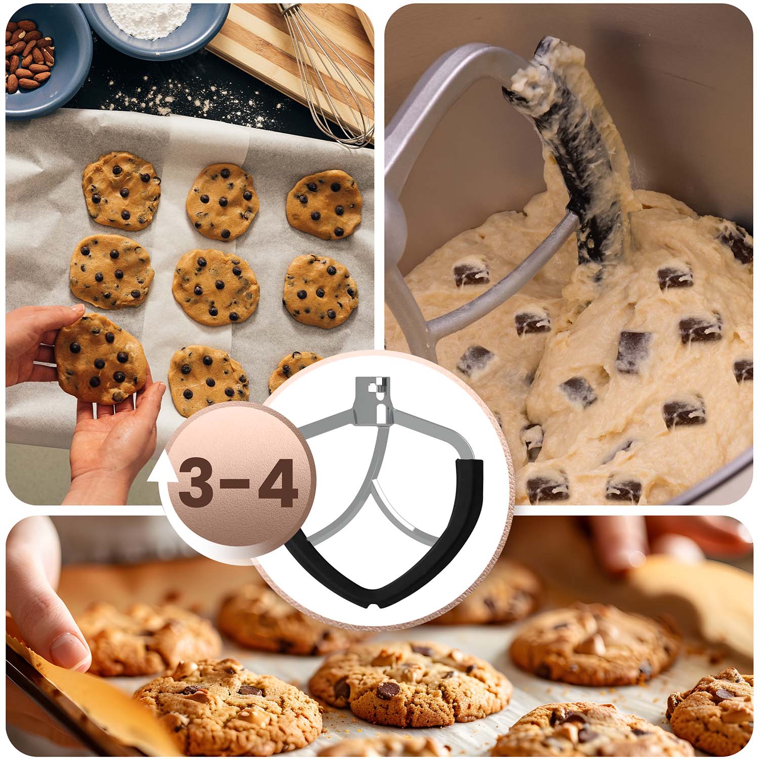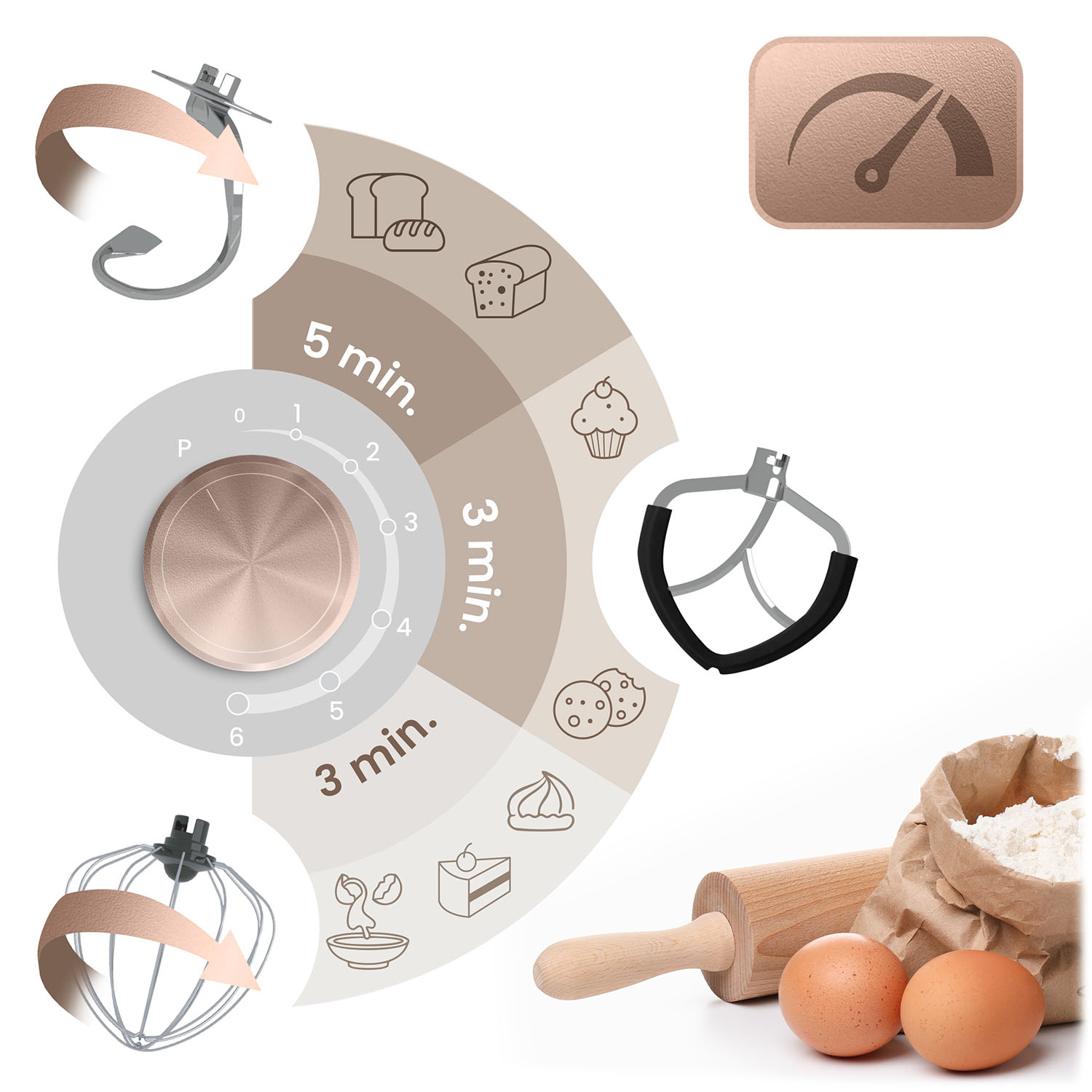 Hak do wyrabiania ciasta najlepiej sprawdza się na prędkościach 1-3, mieszadło do kremów i farszów działa optymalnie przy ustawieniach 2-4, a trzepaczka do piany i bitej śmietany rozwija pełnię możliwości przy prędkościach 5-6 – zawsze idealna konsystencja, bez kompromisów.