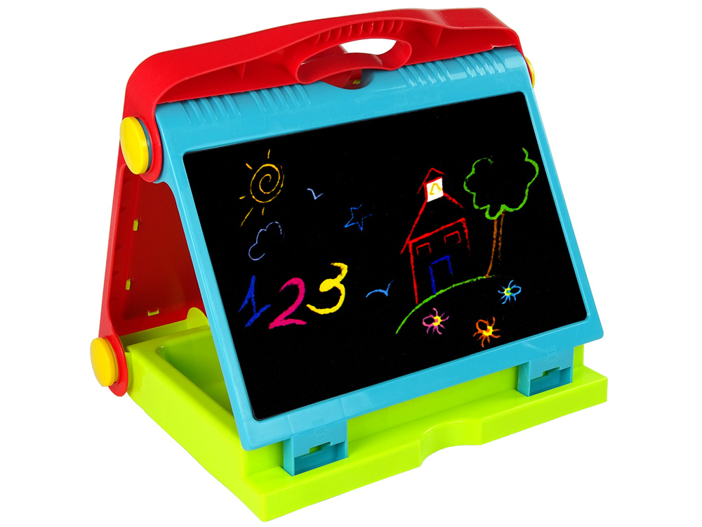 Nowa, edukacyjna, duża tablica zachwyci każdego małego fana prac plastycznych. Na tablicy można pisać flamastrem lub kredą, odrysowywać różne szablony.