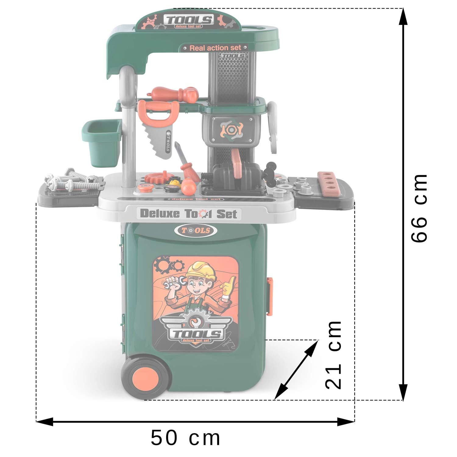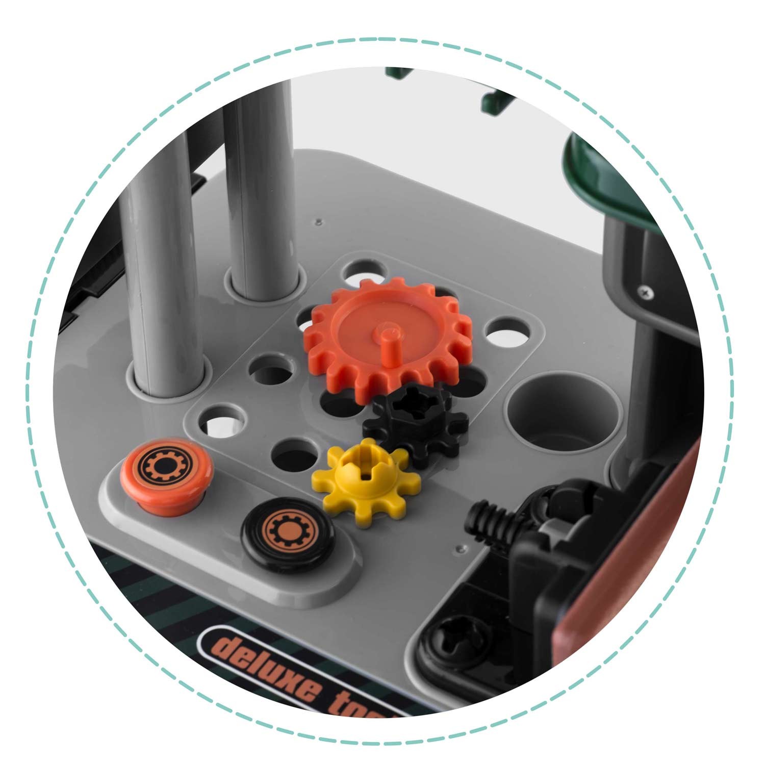 Prezentujemy stół warsztatowy dla dzieci, wyposażony w półeczki i zestaw narzędzi przypominających te prawdziwe, tylko wykonanych z plastiku łatwego do utrzymania w czystości.