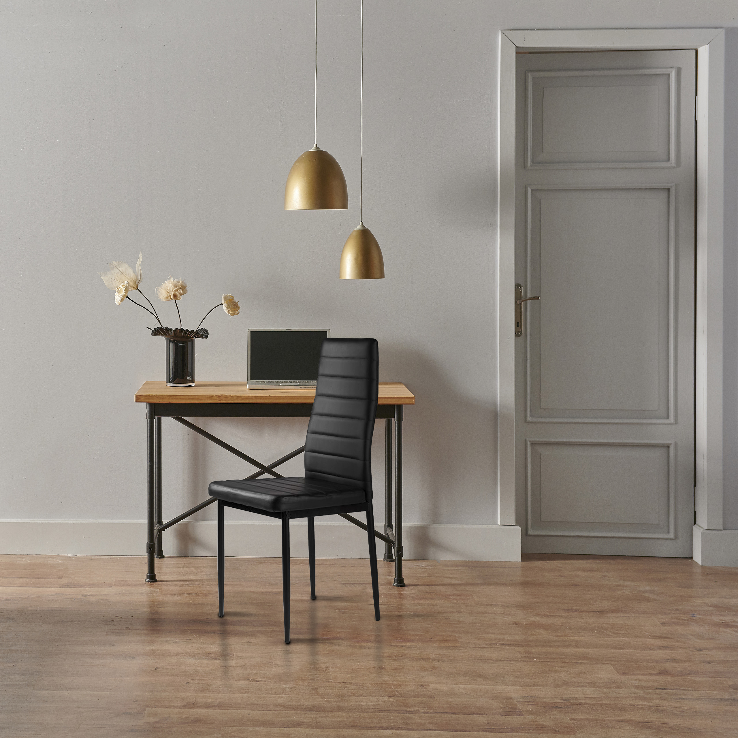 Krzesła będą świetnie współgrać z rodzinnym stołem w Twojej jadalni i kuchni. Czarne poszycie wykonane z miękkiej ekoskóry i czarne, proste nogi tworzą ciekawe połączenie, które sprawia, że krzesła będą świetnie wyglądać i wpasują się w każdy rodzaj wnętrza, dodając mu wyjątkowego charakteru.